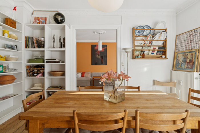 Her får du det bedste af to verdener: en klassisk bolig med sjæl og atmosfære, placeret midt i byens mest levende kvarter. En lejlighed, der både skal ses og mærkes.