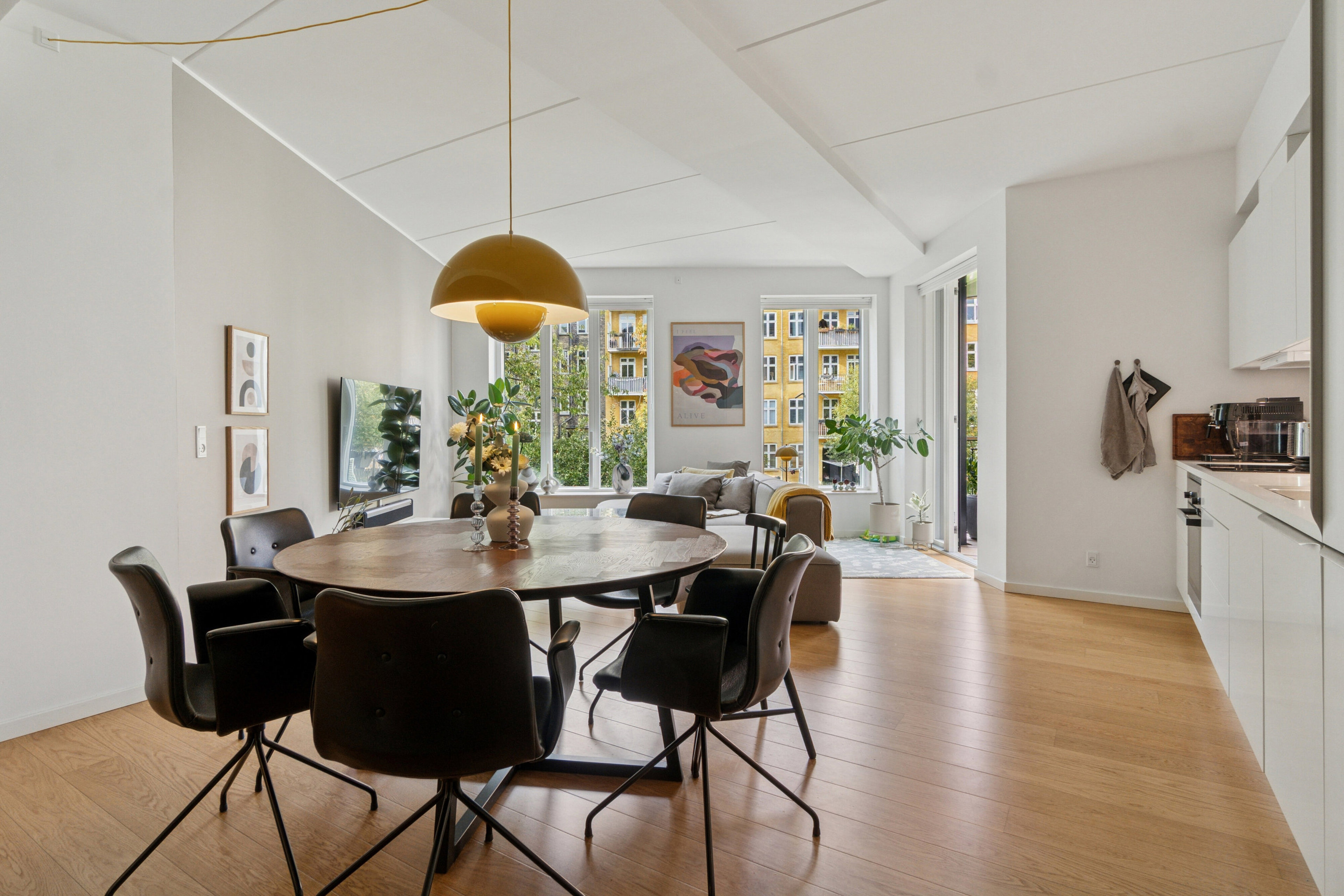 Lejlighedens naturlige samlingspunkt er det store køkkenalrum i åben forbindelse med stuen. De store vinduespartier lader dagslyset strømme ind og skaber en indbydende atmosfære, hvor madlavning, samvær og hverdagsliv smelter sammen. Fra stuen åbner brede glasdøre ud til en vestvendt altan, hvor du kan nyde solen, udsigten til den frodige gård og den rolige aftenhimmel, når byen langsomt falder til ro.
