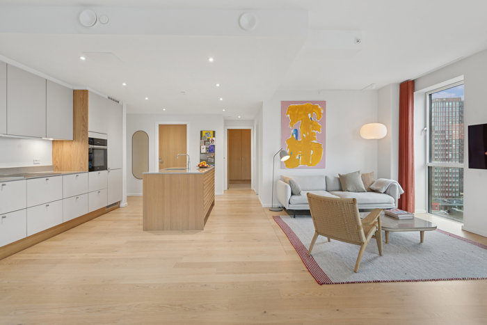 Opholdsrummet imponerer med et fantastisk lysindfald og panoramaudsigt over hovedstaden, fra Øresundsbroen og Sverige i horisonten til byens ikoniske tårne og grønne parker. Her kan man nyde morgenens første solstråler over Vesterbro og aftenlyset, når solen går ned over Søndermarken. Den østvendte altan, der er blandt de største i forhold til de andre tårne i Carlsberg Byen, inviterer til ro og nærvær, perfekt til morgenkaffen med udsigt over byen.