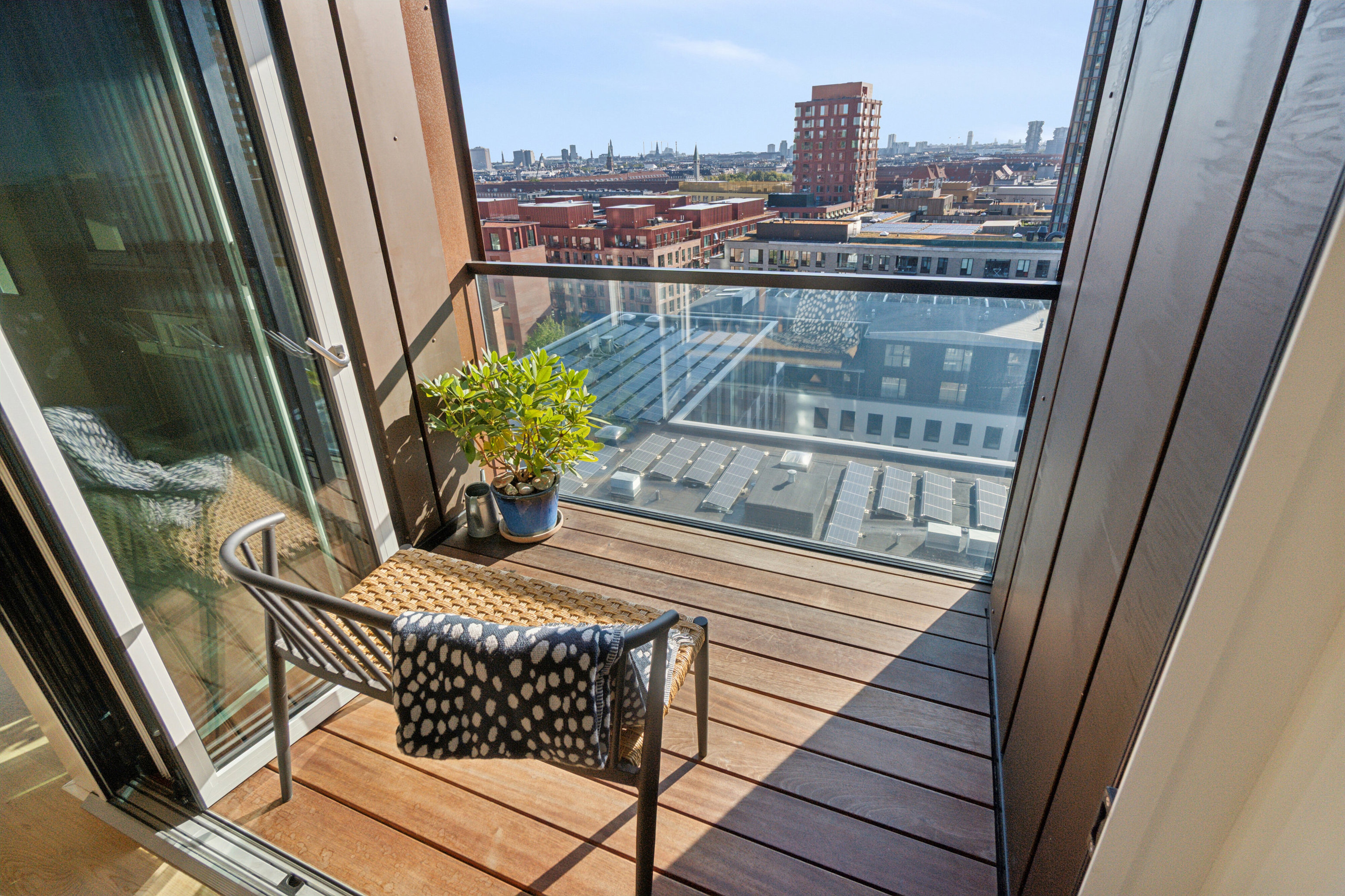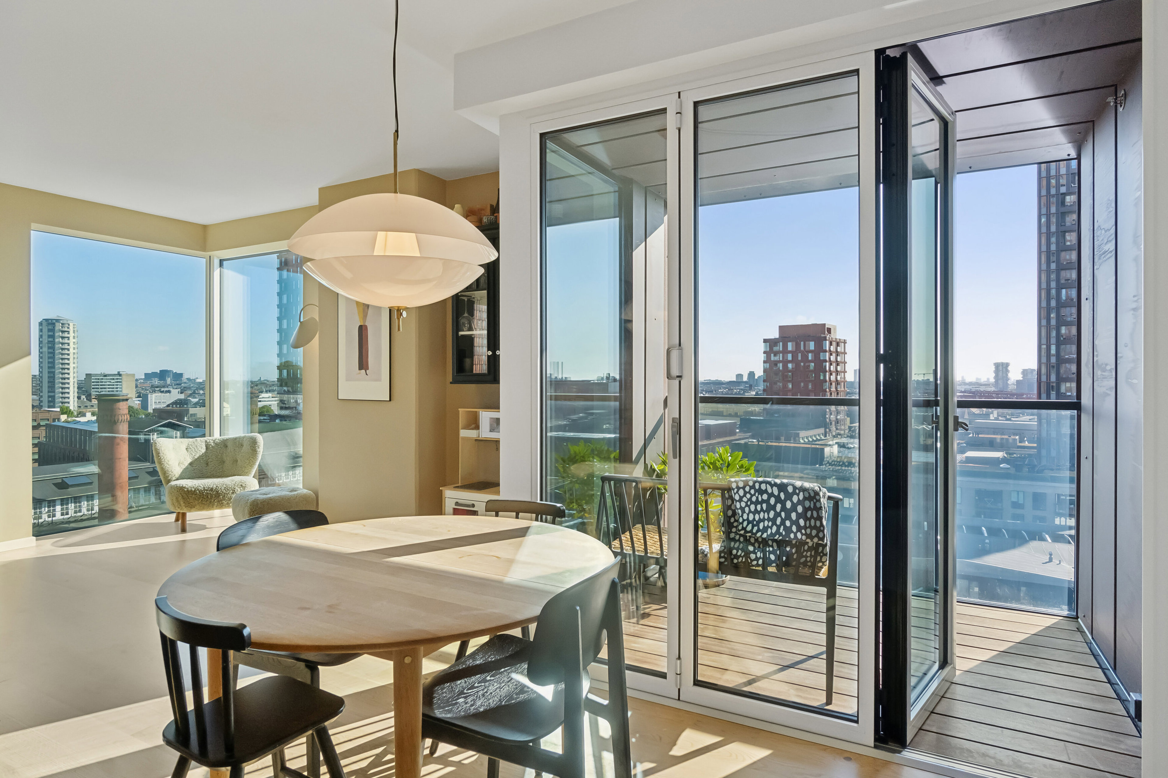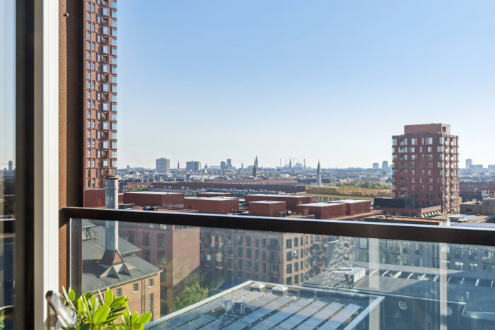Som I træder inden døre i boligen, er det selvsagt den smukke udsigt over hovedstaden og den grønne oase, der kendetegner udtrykket. I kan se vartegn på vartegn, grønne parker og flot arkitektur. Alt sammen sikres af lejlighedens orientering mod øst.