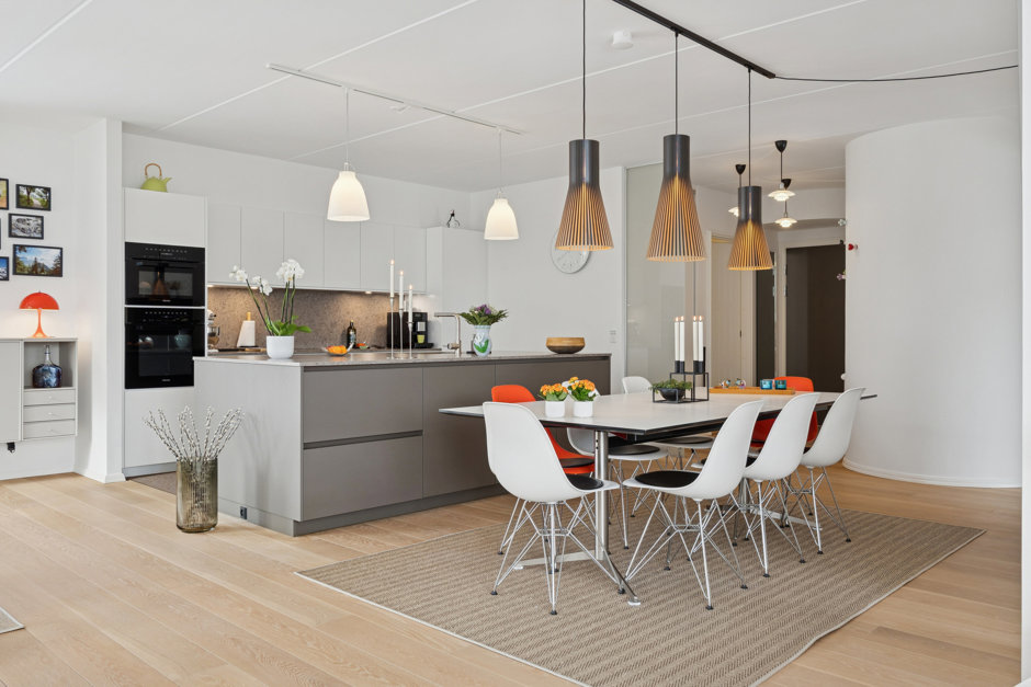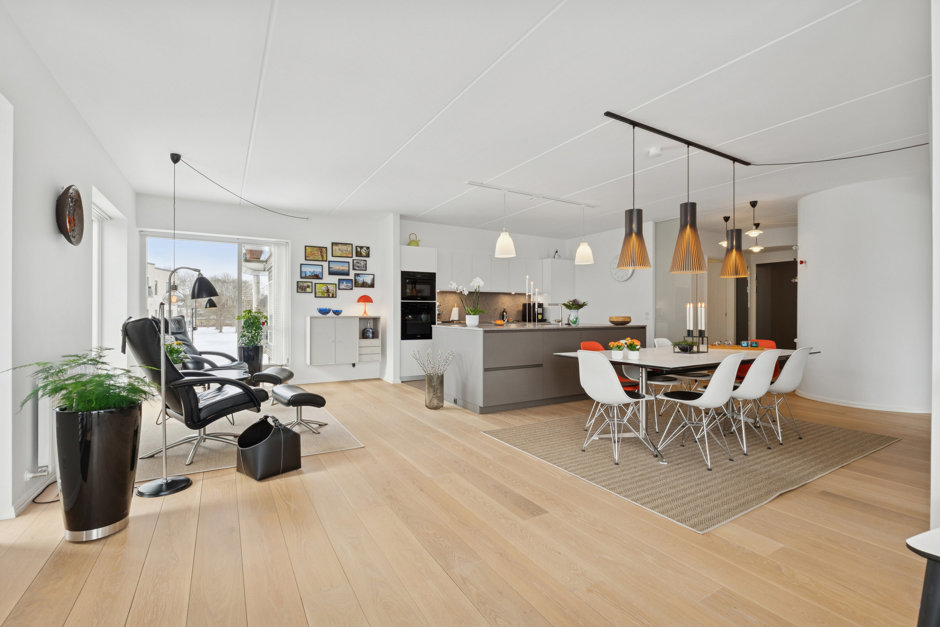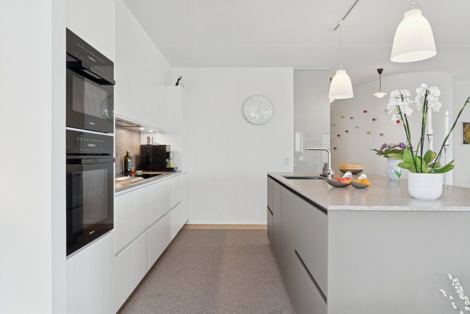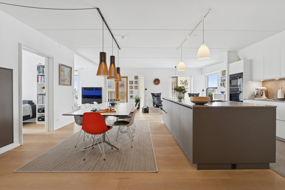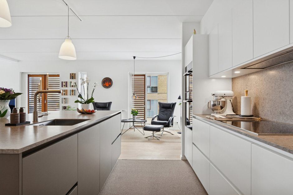 Lejlighedens hjerte er det store, åbne opholdsrum, hvor stue og køkken smelter harmonisk sammen. Lysindfaldet er fremragende fra morgen til aften, og rummet indbyder til både hverdag og gæstebud. Her er god plads til både sofahjørne og et større spisebord. Køkkenet fra 2024 er udført i kvalitetsmaterialer fra Multiform og byder blandt andet på et bredt induktionskomfur og 2 ovne – ideelt til den madglade.