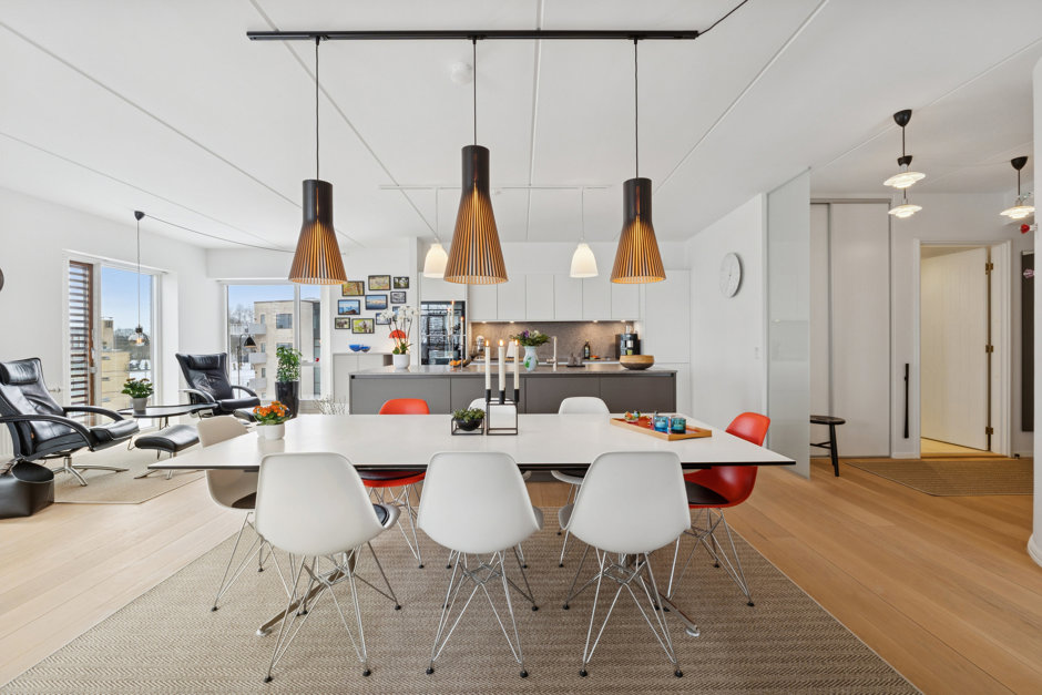 Gæstetoilet og badeværelse har gulvvarme, og i resten af boligen prydes rummene af smukke, lyse egeplankegulve. Et effektivt ventilationsanlæg sikrer et behageligt indeklima året rundt, og som en eksklusiv detalje er dørgrebene designet af Arne Jacobsen – en diskret, men markant finish.