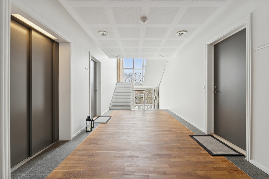 Allerede ved ankomsten fornemmes den gennemførte kvalitet. De grønne fællesarealer fremstår indbydende og velholdte, og parkeringskælderen er elegant integreret under ejendommen. Herfra kan du tage elevatoren direkte op – eller vælge trappen til tredje sal, hvor en rummelig og præsentabel opgang byder velkommen og giver en forsmag på den boligoplevelse, der venter.