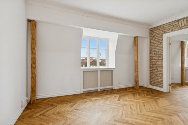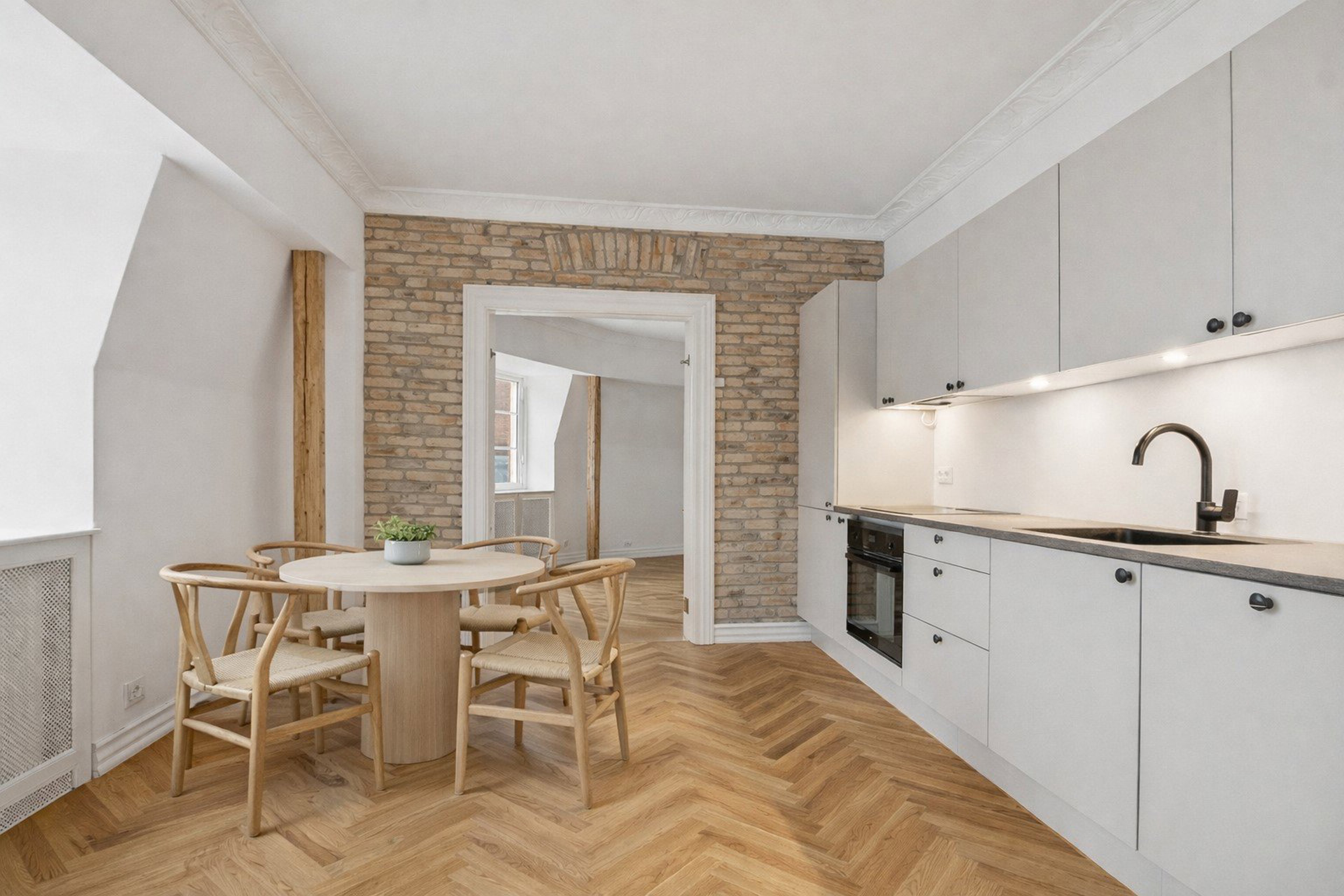 Lejligheden er gennemrenoveret fra ende til anden og byder på en række super fede detaljer, der virkelig skiller sig ud: Fantastisk sildebensparket i eg, rå murstensvæg, fjernede skunkarealer og synlige, lodrette bjælker, som tilfører boligen både kant og personlighed. Her får du en unik kombination af moderne luksus og rå charme.