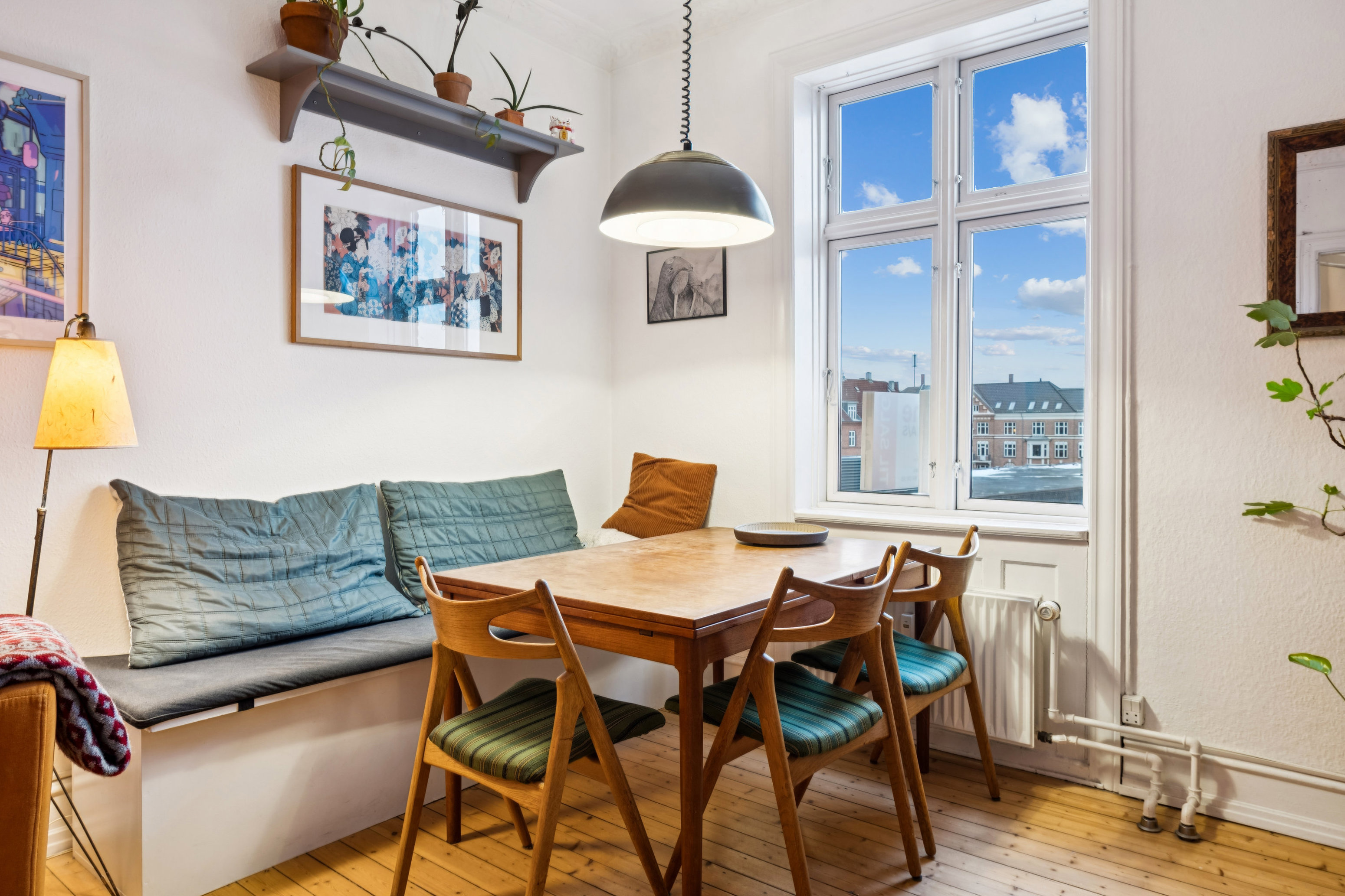 Det er en 52 m2 stor lejlighed, der er hovedperson for dagens tekst, og så indebærer den en tur helt op øverst i ejendommen. Heroppe er lyset fantastisk og den åbne udsigt over Landsarkivet og Nuuks Plads lige så god. Boligen byder på en klassisk planløsning med en fordelingsentré, der åbner ind til et rummeligt køkken, en stue og et soveværelse med skabsplads, hvor indgangen til det flotte badeværelse med en separat bruseplads også skal findes. Lejligheden er udstyret med masser af charme i form af stuk, trægulve, dannebrogsvinduer og en god loftshøjde. Der skal altså ikke meget til, for at få boligen til at føles som et hjem.