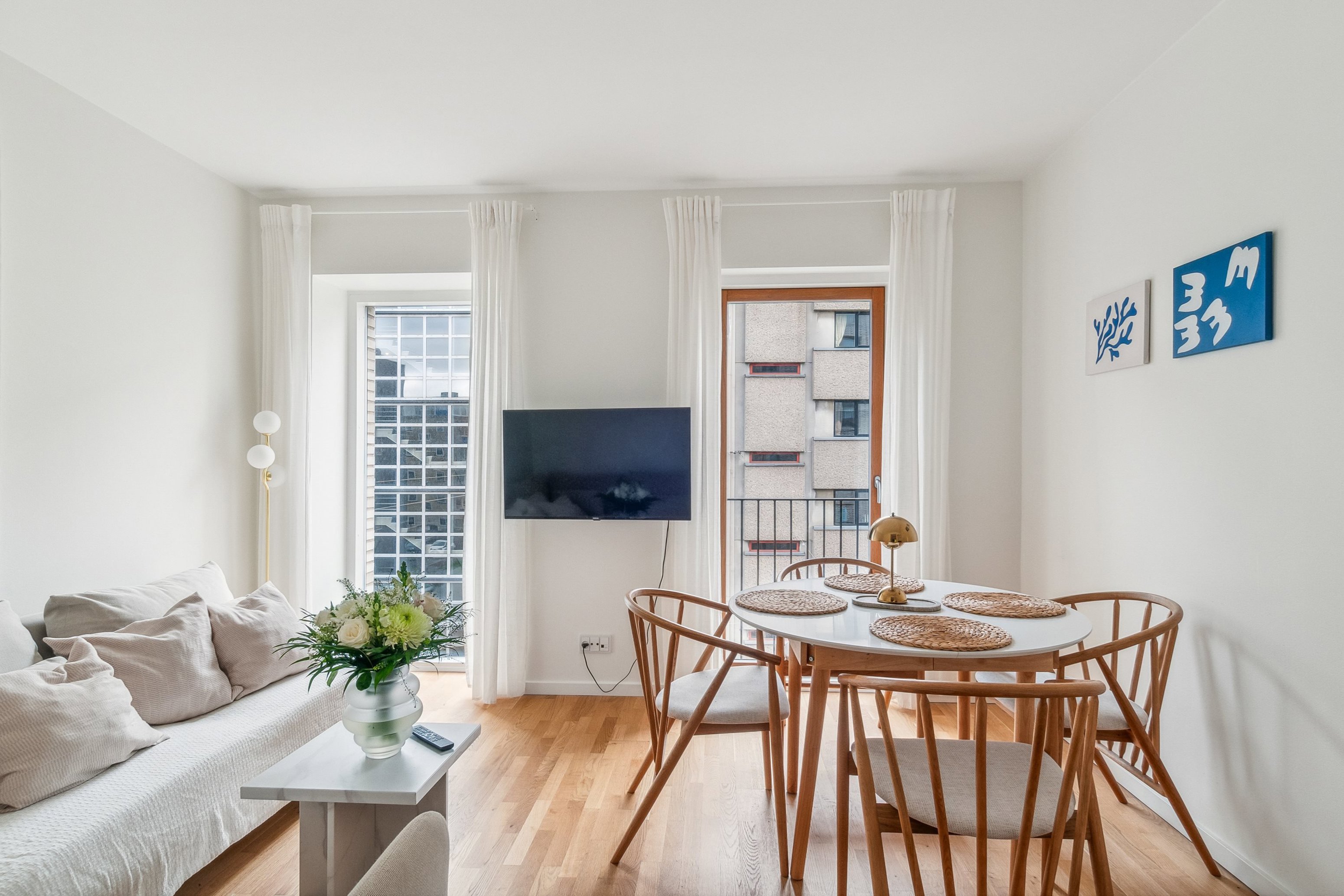 Rene, moderne linjer trækker tråde hele vejen gennem boligen på 3. sal, der kan tilgås via elevator. Der er helt nøjagtigt tale om 53 velindrettede kvadratmeter. De fordeler sig over nogle lyse og indbydende rum, hvor stue og køkken smelter sammen. Således kan du glæde dig over et åbent og luftigtopholdsrum, som giver plads til både sofasæt, spiseområde og hyggeligt samvær. Omgivet af disse gode leverum finder du badeværelset, der præsenterer sig i samme stil som resten af hjemmet og byder på såvel vaskesøjle som rainshower. Der er gulvvarme i hele lejligheden, og kvalitets hårde-hvidevarer fra Miele og Quooker.