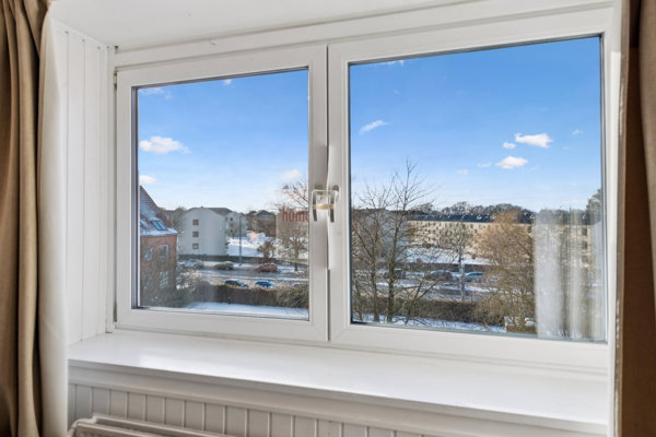 Stuens store vinduespartier lyser rummet godt op og byder på en helt fri udsigt. I stuen er der god plads til at lave et hyggeligt sofahjørne og en spiseplads. Fra stuen er der adgang til det ene soveværelse, med plads til seng og opbevaring. Lejligheden har herudover et stort soveværelse, med plads til stort skab og dobbeltseng. Dertil et badeværelse, med separat brus og gulvvarme. Lejligheden fremstår i god stand og er lige til at flytte ind i, med mulighed for at indrette sig efter behov.