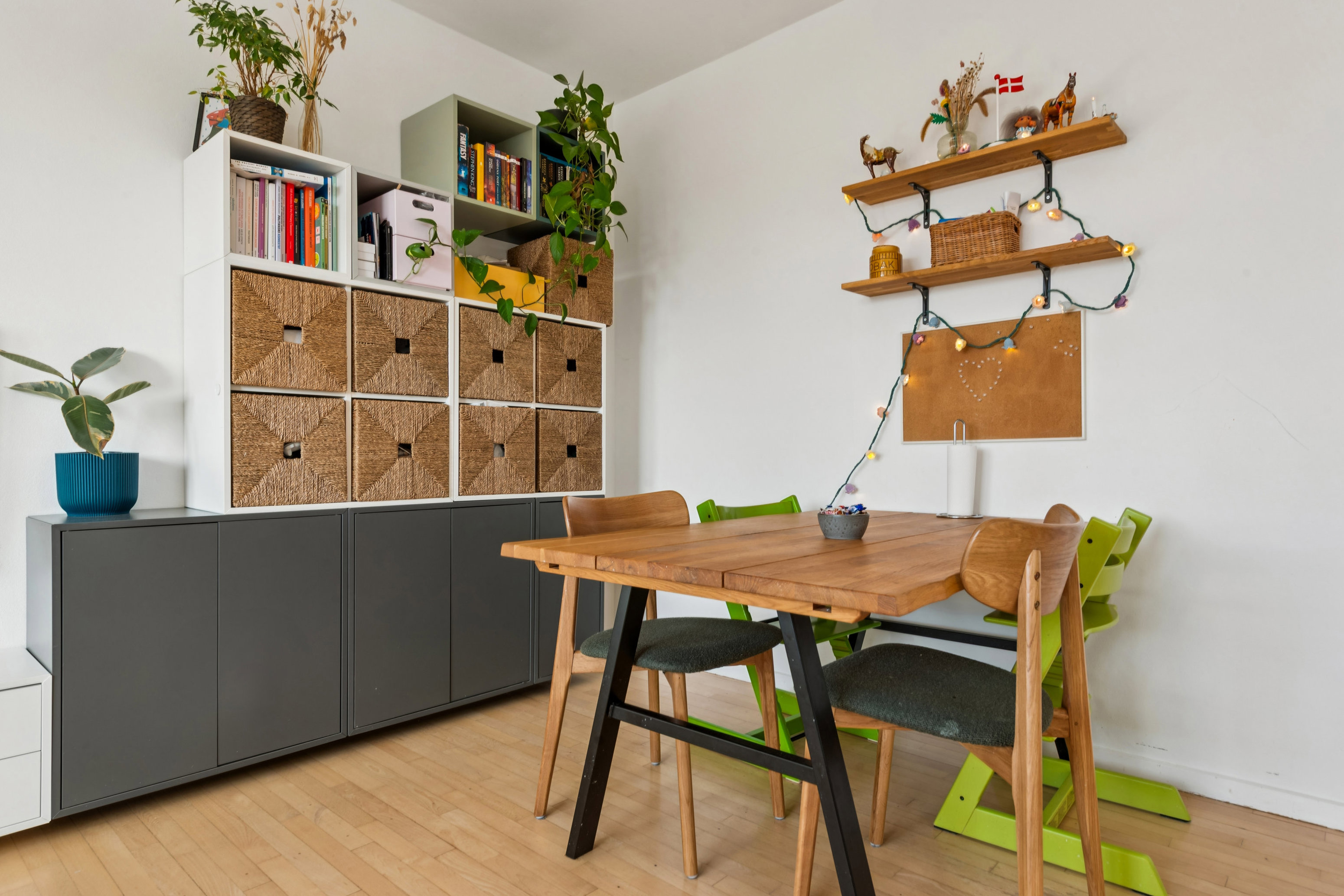 Man træder ind i en entré, som er en praktisk fordelingsgang med god plads til opbevaring. Køkkenet er veludført i stilrene materialer, med god skabs- og bordplads samt opvaskemaskine og vaskemaskine.