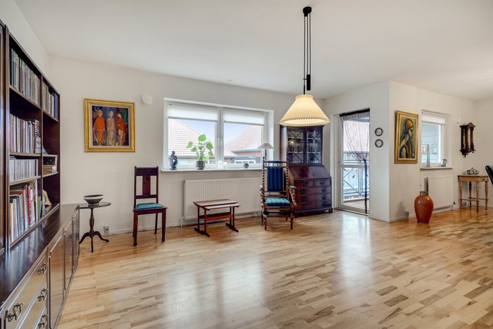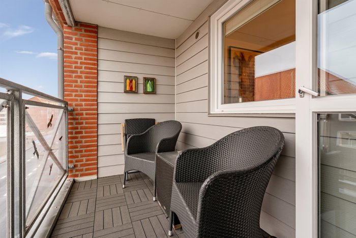 Fra alrummet er der direkte udgang til altanen – et oplagt sted til morgenkaffen, et glas vin i aftensolen eller en pause med udsigt over byens tage. Derudover får du en overdækket terrasse ved indgangen, som giver et ekstra uderum i læ for vind og vejr – perfekt til krukker, en lille caféopstilling eller cykelparkering lige ved døren.