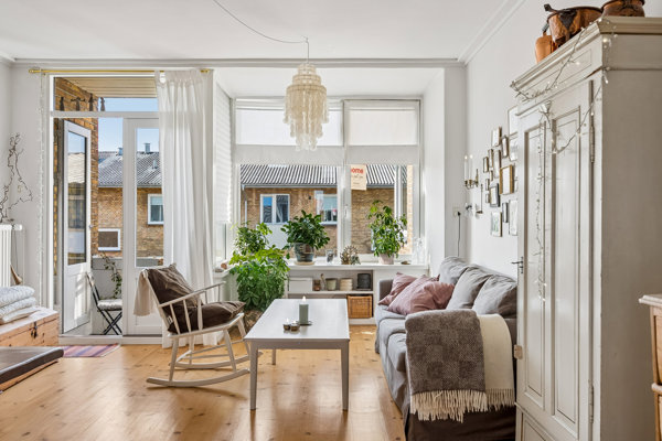 Lejligheden ligger i en fin bebyggelse bestående af klassiske gulstensejendomme fra 1937. Her skal du helt til tops i jagten på dit nye hjem, for du skal sætte kurs mod 3. og øverste sal, hvor lejligheden ligger i private rammer. Du får det bedste af begge verdener, for du har ingen overboer, men du har selskab af det skønneste lysindfald, der nemt finder vej ind gennem de store vinduespartier.