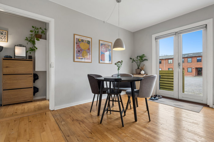 Fra stuen er der udgang til et dejligt vestvendt havestykke – en sjælden og eftertragtet lejlighed i Hedehusene, hvor få lejligheder har adgang til et sådan uderum. Her kan du nyde de lange sommeraftener, dyrke planter eller skabe din egen lille oase midt i byen.