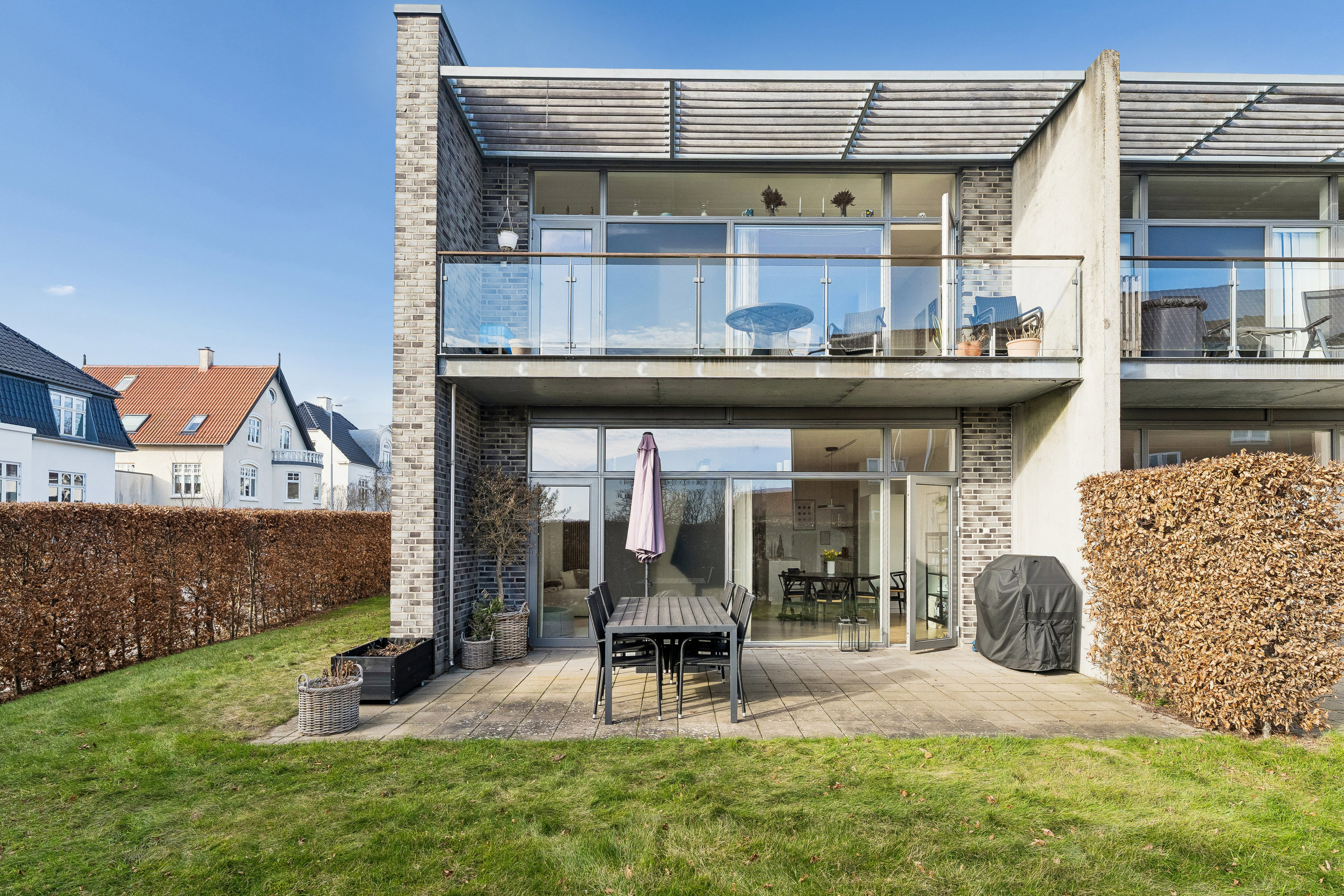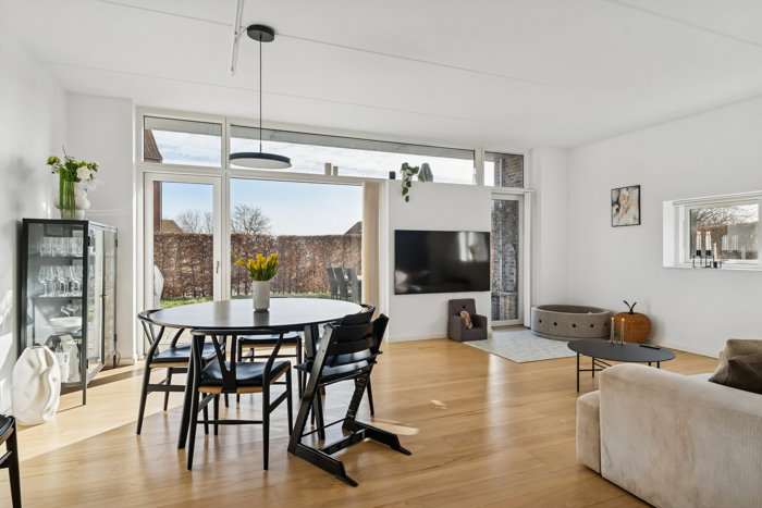 Lejligheden ligger i stueplan uden trapper og er placeret for enden af ejendommen, hvilket giver direkte adgang til en skøn terrasse. Terrassen er orienteret mod sydvest, så solen kan nydes det meste af dagen. Der medfølger desuden brugsret til egen parkeringsplads hvor der er opsat ladestander med 2 udtag.