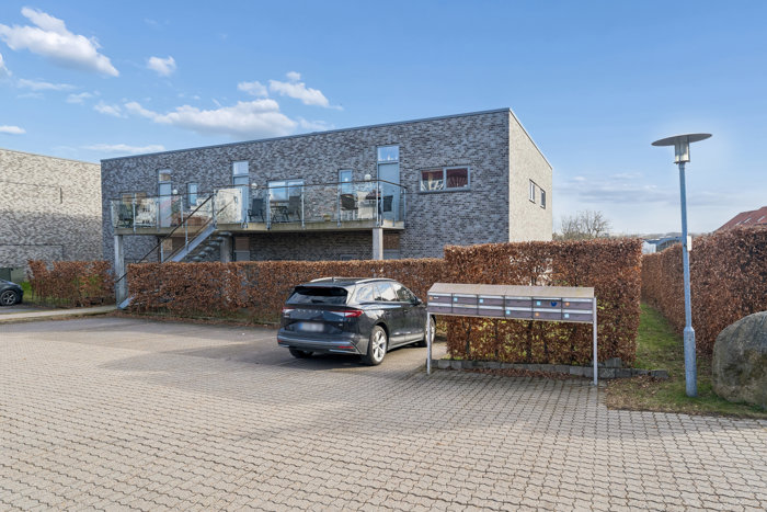 Ejendommen fremstår flot og moderne med fuldbrændte blødstrøgne mursten (Unika Alexandria), Phønix tagpap og termovinduer, som tilsammen giver bebyggelsen et eksklusivt udtryk. Til lejligheden hører også brugsret til et stort, aflåst skur. I nærområdet findes gode parkeringsmuligheder, naturskønne omgivelser, gode indkøbsmuligheder samt kort afstand til Åby Skole og specialbutikker.