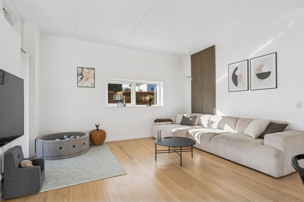 Fra køkken-alrummet er der direkte udgang til den store flisebelagte terrasse, som har en rigtig god størrelse. Her er der rig mulighed for at indrette med spisebord og loungemøbler – perfekt til hyggelige grillaftener og afslapning i sommermånederne.