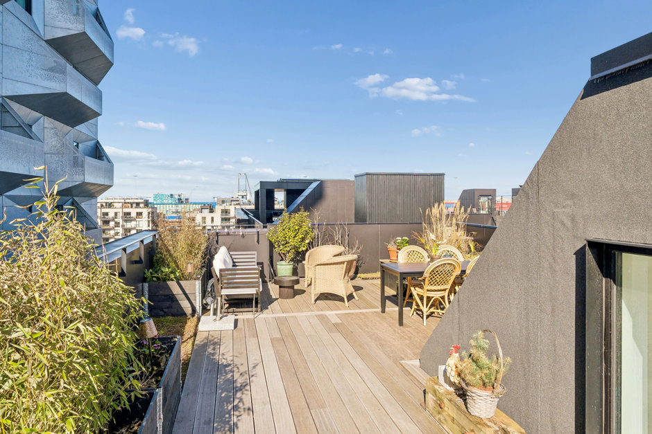 Fra køkkenet kan I både træde ud på den østvendte altan, eller I kan følge trappen op til jeres helt egen tagterrasse. Hele 62 kvm privat uderum med udsigt til Øresund udfolder sig her; perfekt til afslapning og grillet aftensmad, mens solen langsomt sænker sig over de københavnske tage.