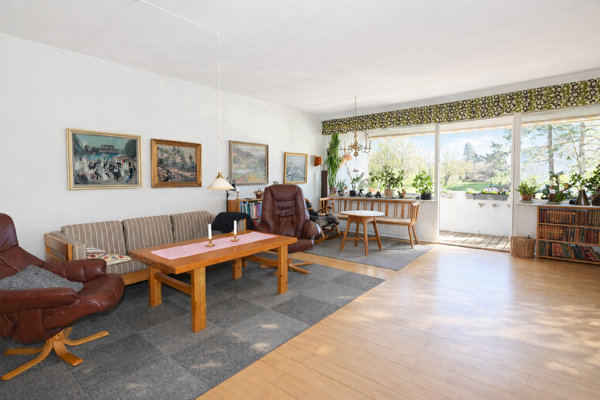 Værelsesafdelingen kan lukkes af, så man eksempelvis kan nyde roen i stuen uforstyrret efter en lang dag. Stuen er indbydende og fleksibel med mange indretningsmuligheder. De store vinduespartier og udgangen til den fantastiske sydvendte altan forlænger opholdsrummet og skaber en skøn sammenhæng mellem inde og ude.