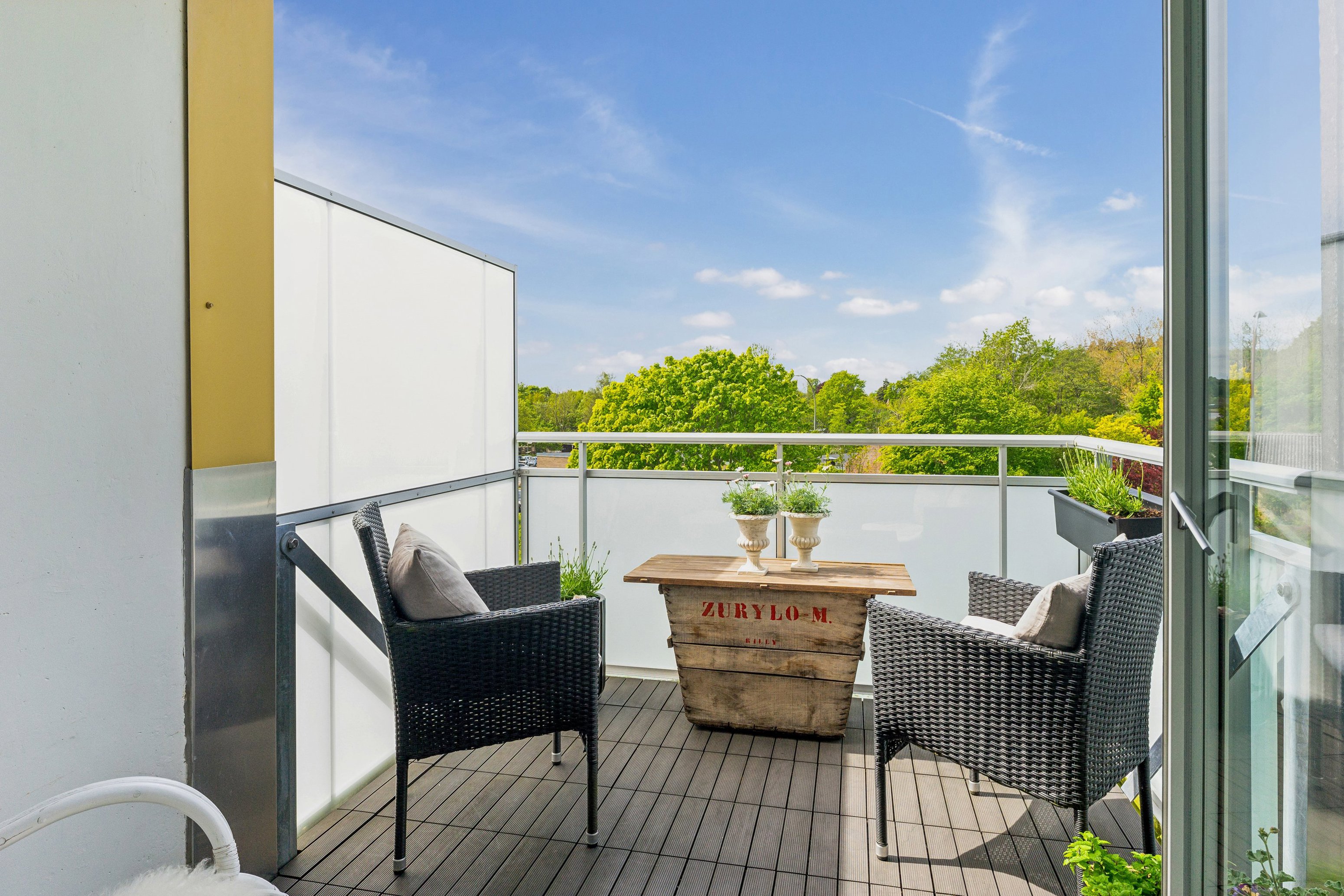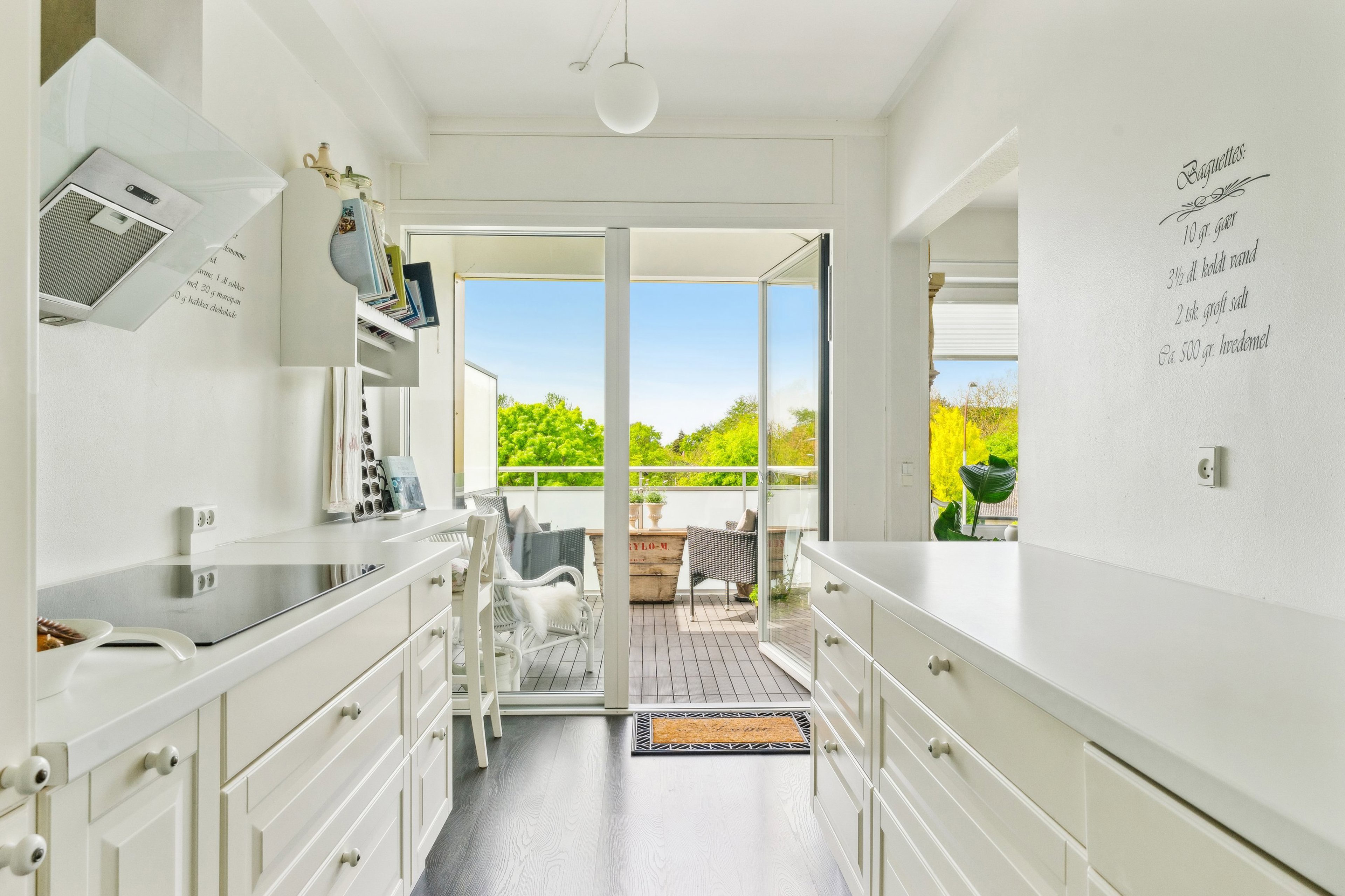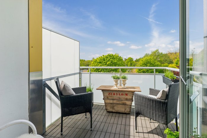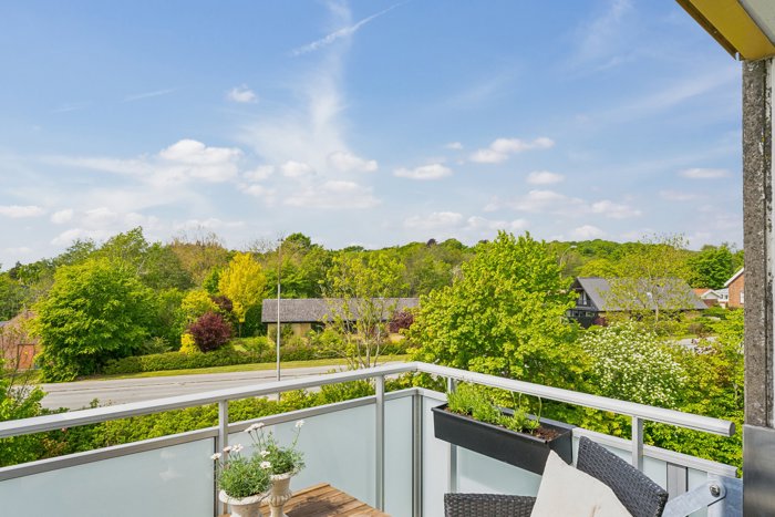 Fra køkkenet er der direkte udgang til altanen, hvor du kan nyde privatliv og udsigt til de grønne omgivelser – et skønt frirum lige udenfor døren.