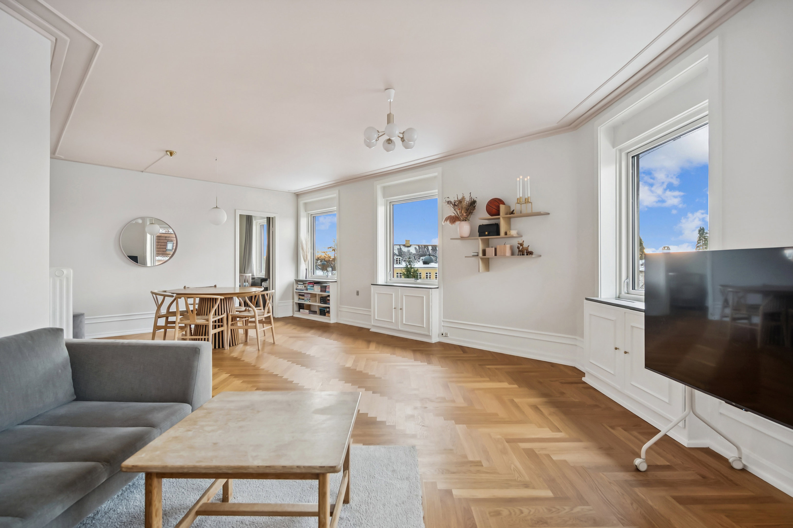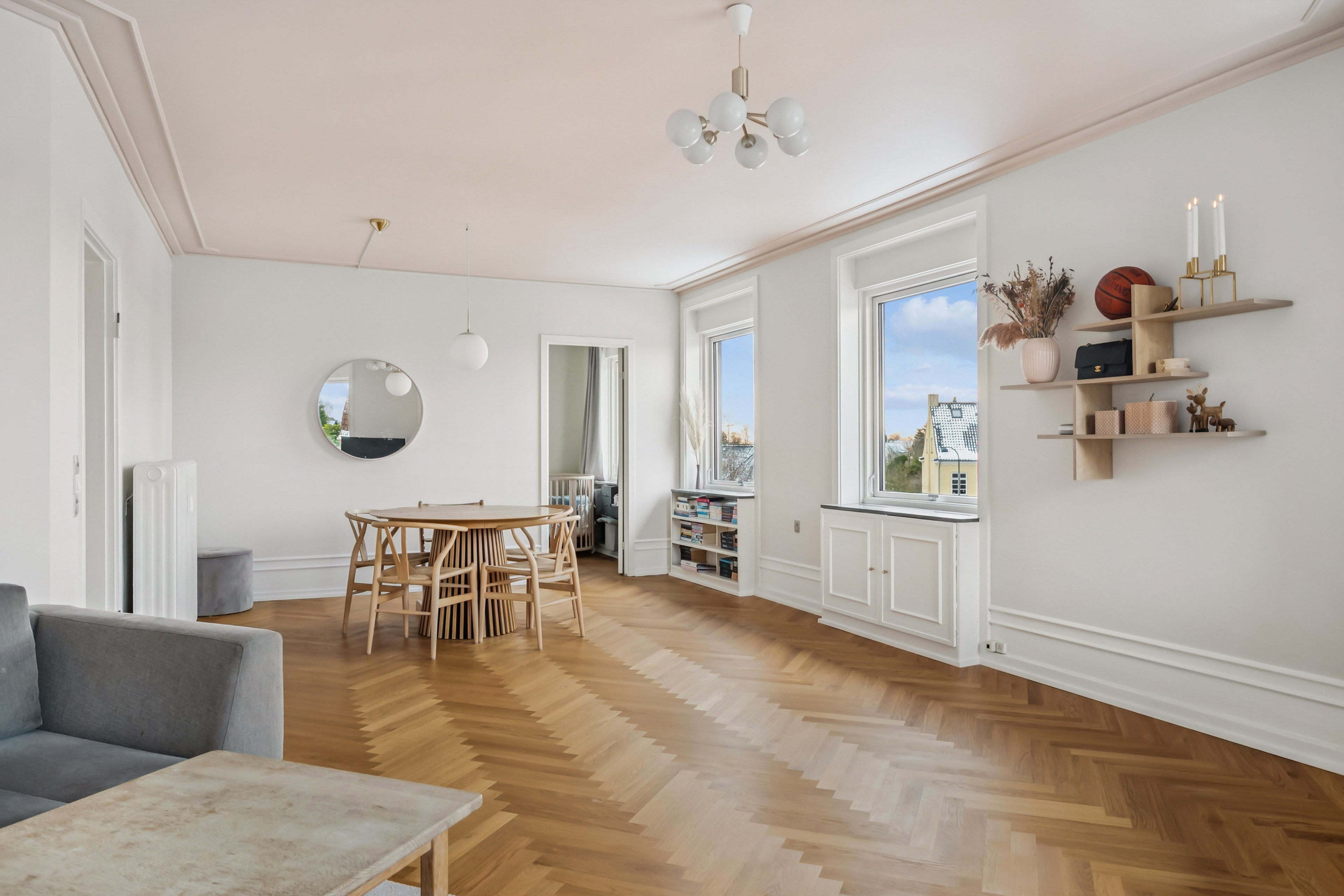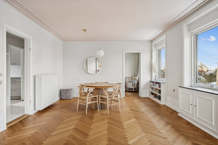 Det er dog nok stuen, I vil forelske jer allermest i, for mens smukke sildebensgulve pryder forneden, er loftet udsmykket med fin stukkatur i en varm rosa farve. Mod syd strømmer lyset ind ad vinduerne langs hele den ene væg, og da lejligheden ligger ugeneret uden direkte indkig, kan I nyde udsigten til blå himmel. Det store leverum gør sig perfekt til såvel rolige hverdage som festlige weekender.