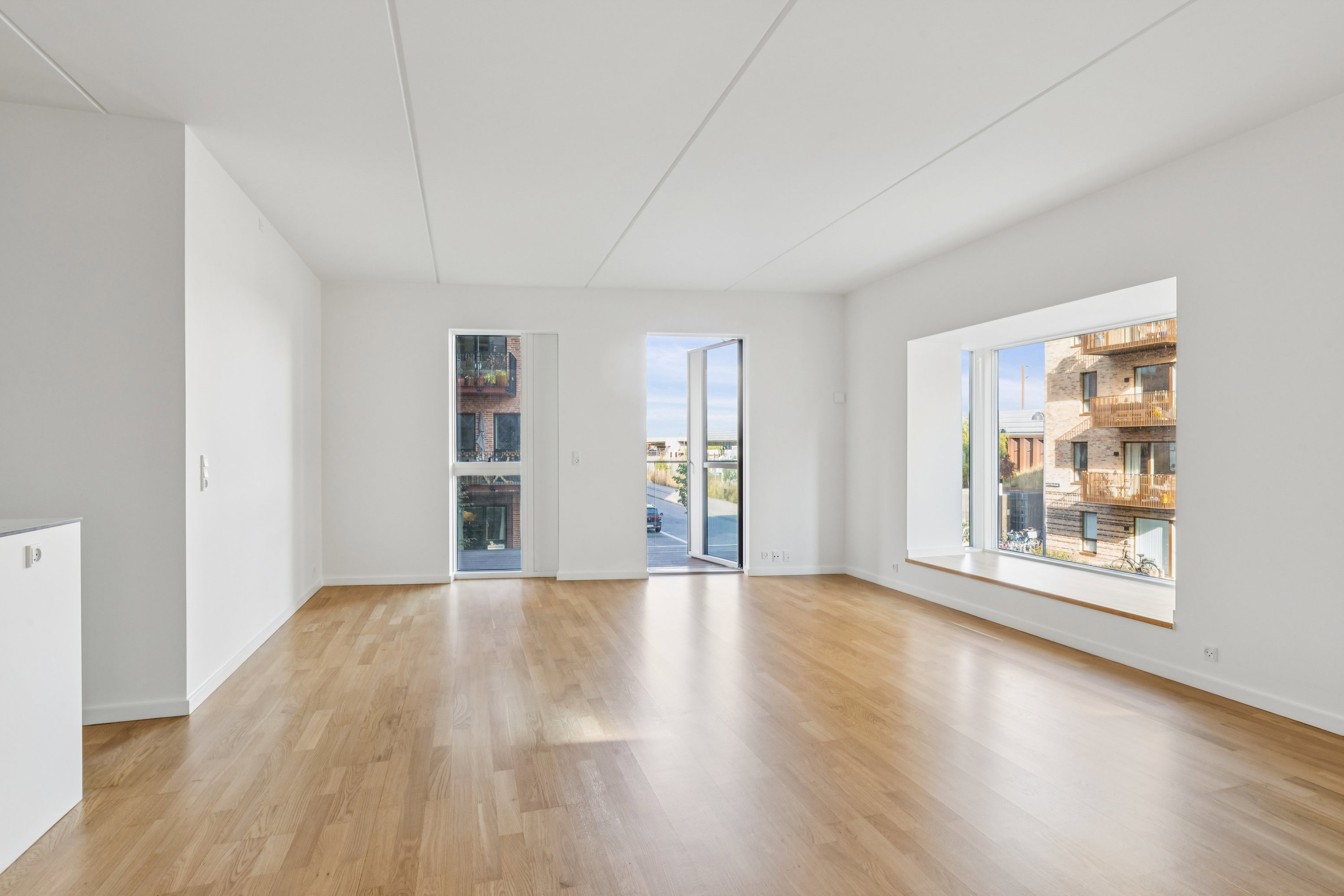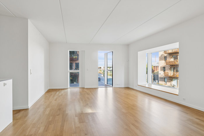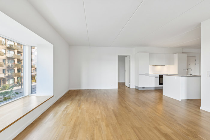 Og så til selve lejligheden! Det kan være alt fra børnefamilien til det unge såvel som det ældre par, der falder for den stilrene bolig. Det er en veldisponeret planløsning, der fordeler pladsen over nogle gode rum med en smagfuld indretning. Fra entréen kan I bl.a. tilgå et stort badeværelse med vaskefaciliteter, og dertil kommer tre værelser og et praktisk depotrum. I hjertet af det hele ligger opholdsrummet, som binder hjemmet sammen og sætter fokus på samværet. Lyset finder vej ind gennem store vinduer, og særligt ét vindue udmærker sig, for her får I en skøn karnap med indbygget bænk.