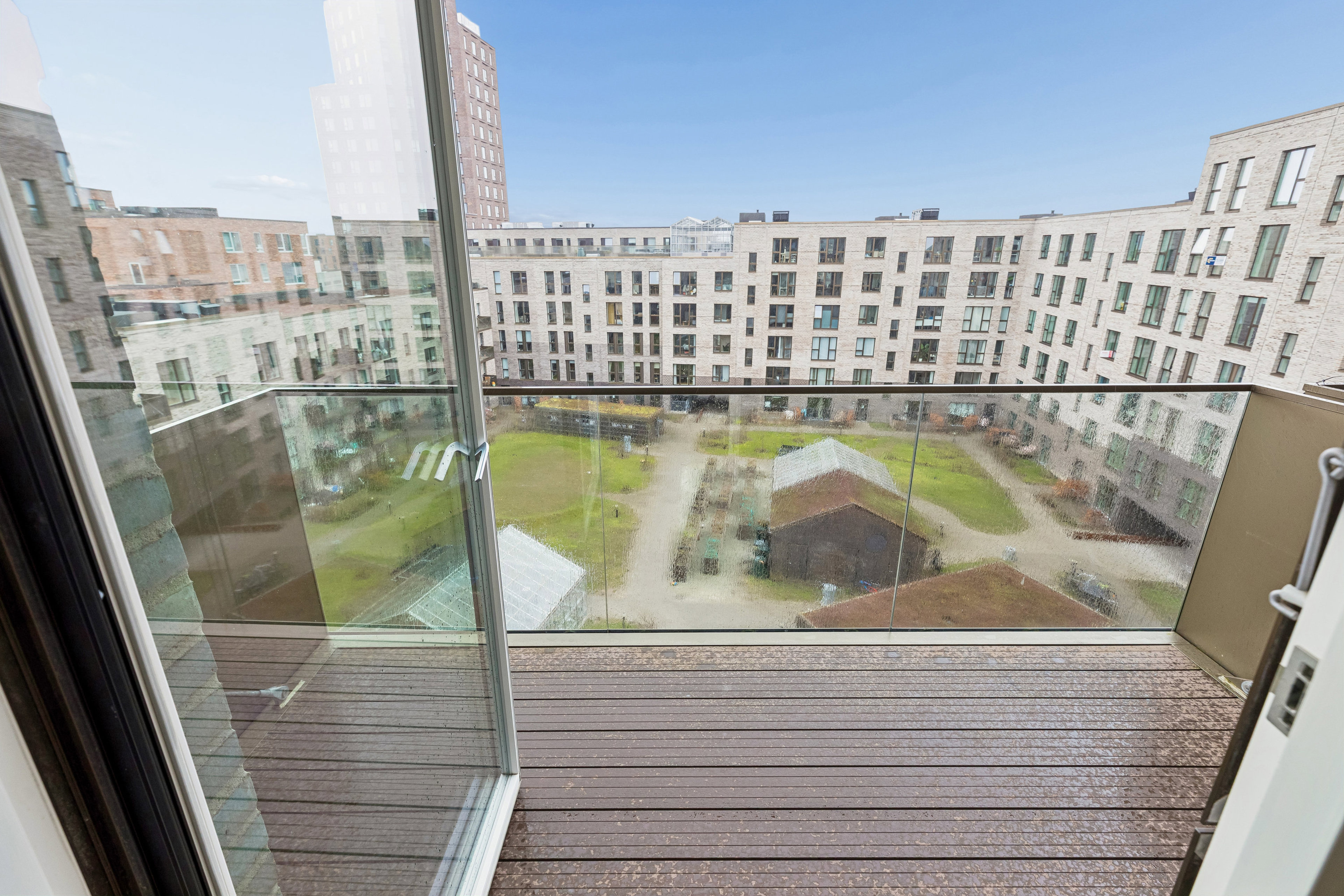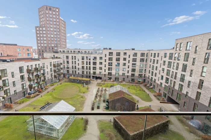 I bosætter jer i en flot ejendom fra 2020, der bag facaden gemmer på et grønt og indbydende gårdmiljø, der med græsplæner, nyttehaver og væksthuse skaber en rolig oase midt i byen. Som en ekstra bonus kan I nyde udelivet helt oppe under himlen på den dejlige tagterrasse, og når I ønsker mere private rammer, kan I trække jer tilbage til femte sal, hvor jeres egen altan venter med sol fra syd.