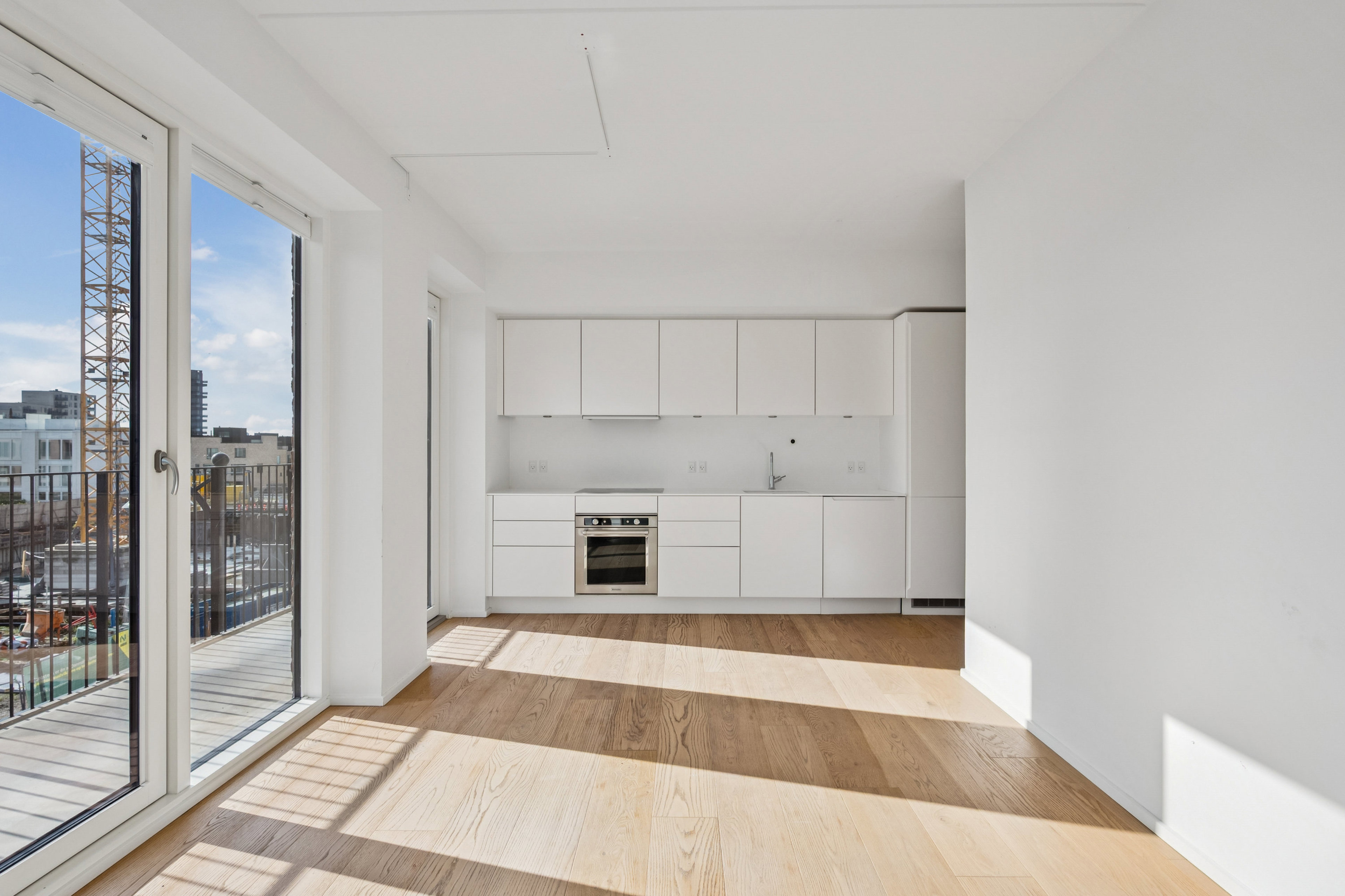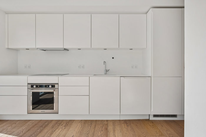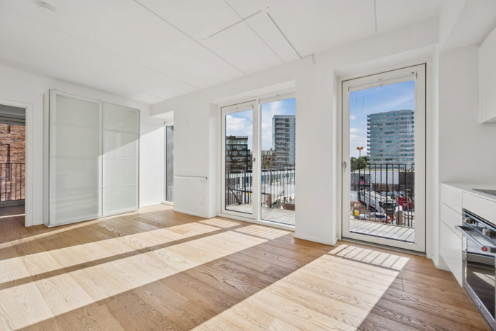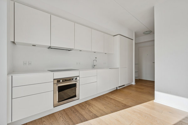 Inden døre fortsætter de rene linjer, og allerede i entréen mærker I rummeligheden og det generøse lysindfald, der leder jer videre ind i boligens hjerterum. På vejen passerer I et nydeligt badeværelse med spots i loftet, separat bruseniche, væghængt toilet og dobbelt håndvask. Ja, her er tænkt over hver en detalje, og med alle hårdehvidevarer i det tidløse, grebsfrie køkken, er listen over praktiske fordele komplet. Det store opholdsrum folder sig ud med lys, luft og rigelig plads – samt med afsæt til boligens to værelser, der begge har franske altaner, mens det ene også byder på indbyggede skabe.