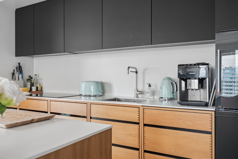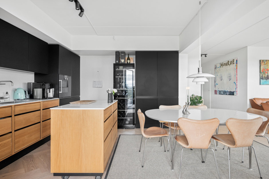 Jeres kommende hjem ligger på 11. etage, og allerede fra første skridt indenfor bliver I betaget af boligens behagelige lysindfald og gennemtænkte løsninger. Entréen er udstyret med faste skabe, så jakker og sko kan pakkes praktisk af vejen, og herfra ledes I videre til det samlede opholdsmiljø, hvor køkken og stue smelter sammen i en herlig helhed. Det stilrene køkken med mørke elementer, fingertappede skuffer og tilhørende hvidevarer giver perfekte rammer, når maden skal tilberedes. Rummet prydes af smukke gulve i sildebensmønster og store vinduespartier fra gulv til loft, så dagslyset frit strømmer ind, samtidig med at I nyder udsigten over vandet og bylivet. Videre finder I to gode værelser, begge med faste skabe, samt et rummeligt badeværelse med bruseniche og plads til vaskefaciliteter.