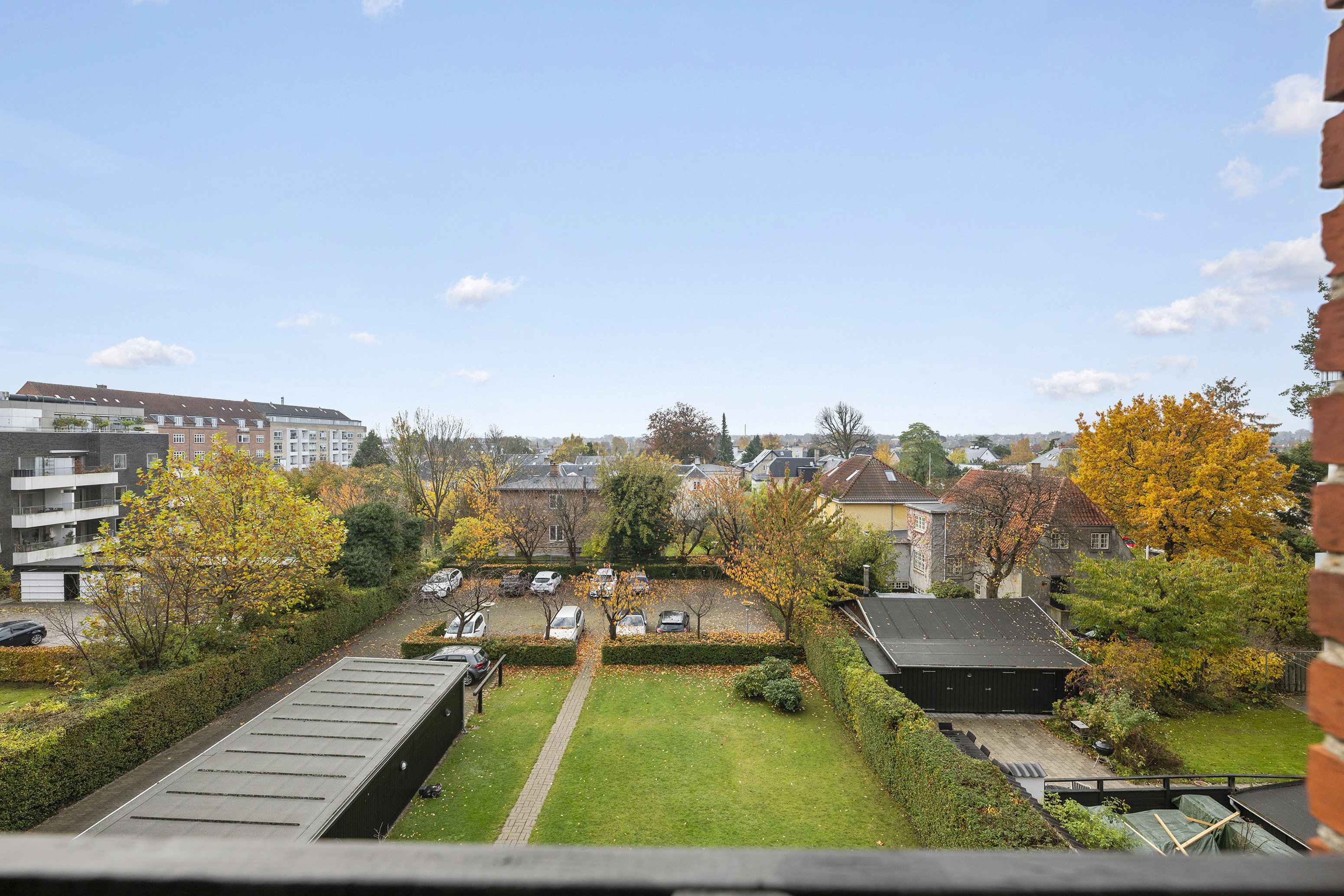 I én af de bedste ejendomme på Jægersborg Allé - Her får du en indbydende lejlighed med stor privat parkering bag ejendommen og en bagindgang til en stor fælles hall, hvor elevatoren tager dig op til denne lyse lejlighed over trætoppene med en stor sydvendt terrasse.
