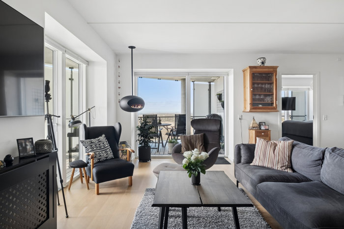 Lejligheden byder velkommen via en rummelig entré med adgang til et lyst og moderne badeværelse med gulvvarme, separat bruseniche og vaskesøjle. Boligens naturlige samlingspunkt er det store køkken/alrum, der smelter sammen med stuen i et åbent og indbydende opholdsrum. De store vinduespartier sikrer et fantastisk lysindfald, og fra stuen er der direkte udgang til den sydvestvendte altan, hvor udsigten og stemningen kan nydes året rundt. Her er plads til både spiseafdeling og hyggeligt loungeområde.
