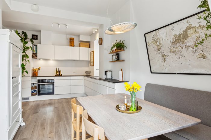 Lejligheden er gennemrenoveret i 2020 med et lækkert, lyst og grebsløst køkken, der har spiseplads til seks personer og udgang til en stor, skøn og privat tagterrasse.