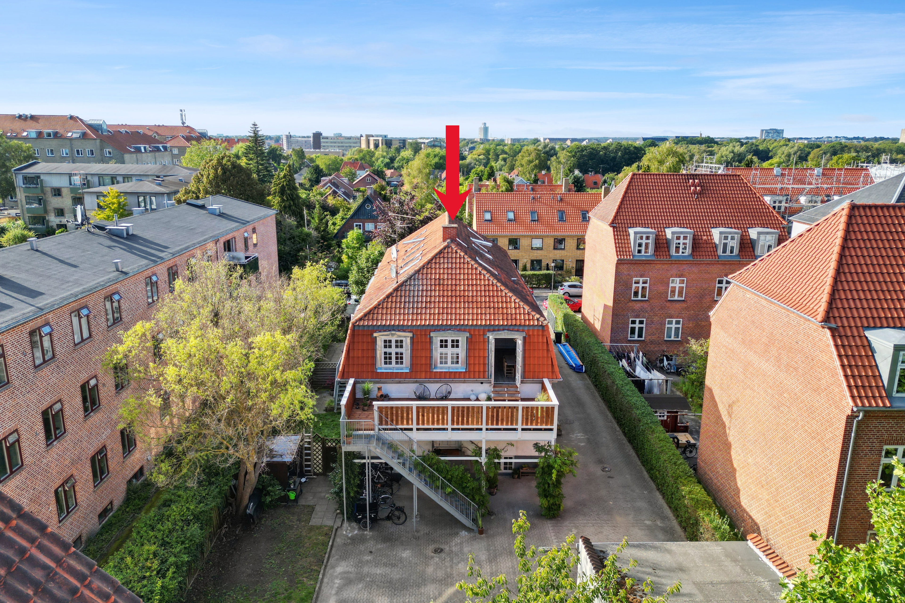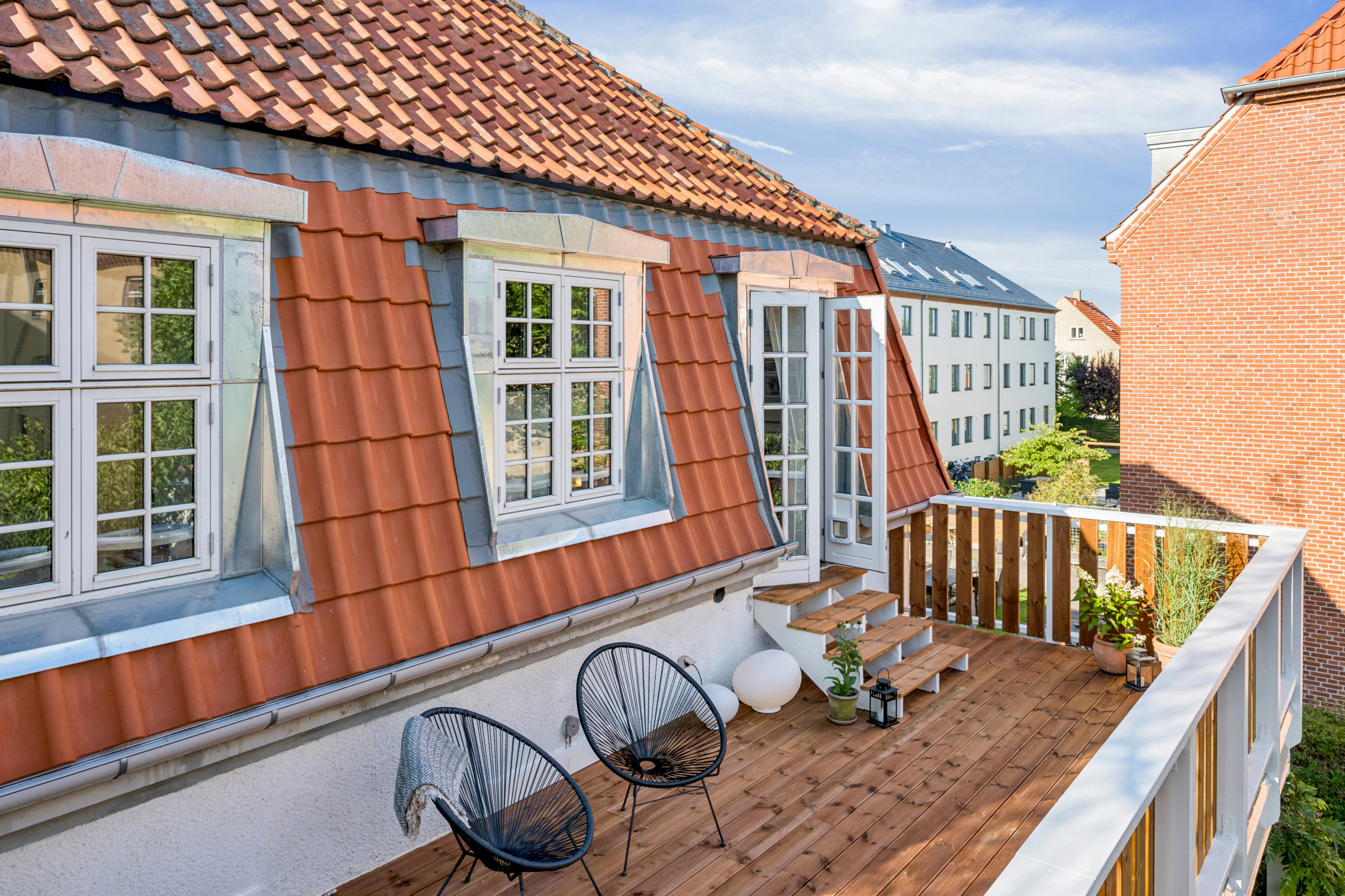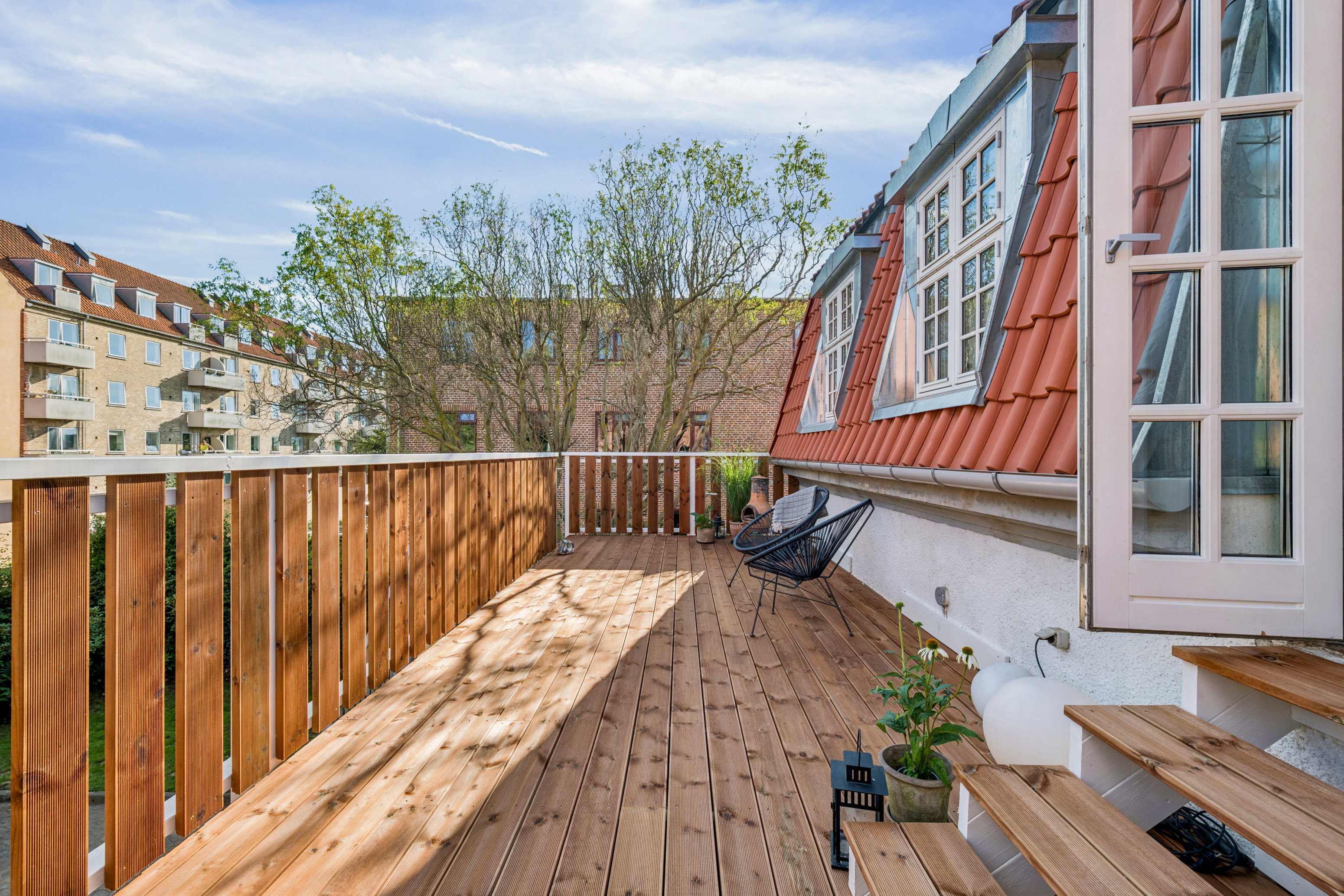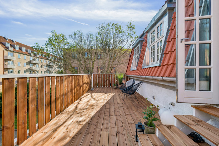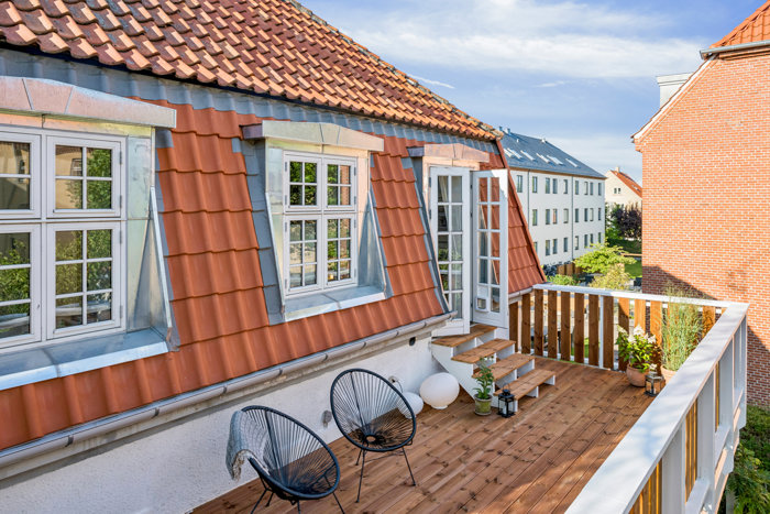 Som nævnt er der en stor og rigtig dejlig tagterrasse, hvor I – både alene og med venner eller familie – kan nyde udelivet og solen i uforstyrrede omgivelser. Stil døren til køkken-alrummet på vid gab og inviter sommerfornemmelserne helt ind i hjemmet. Derudover hører en fælles have og parkeringspladser med til lejligheden.