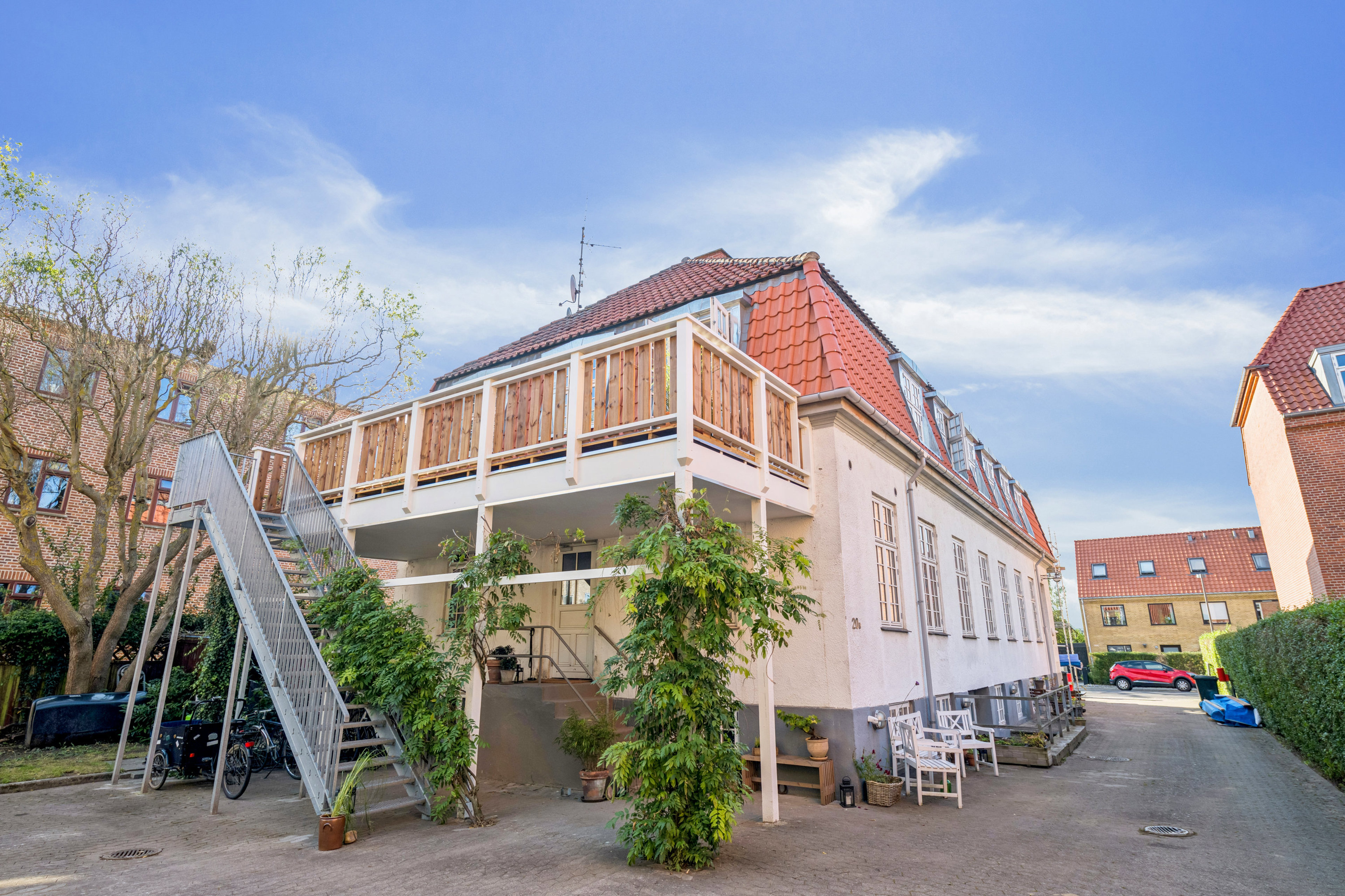 Den historiske ejendom er opført i 1931 og har tidligere huset systue, marmeladefabrik og senere Lene Løvendahl Dansestudie, hvor blandt andre Silas Holst har danset. I 2020 blev ejendommen ombygget til fire skønne boliger. Den fremstår med mansardtag i røde tegl, som i 2025 er blevet renoveret og isoleret efter alle kunstens regler, så lejligheden i dag er energioptimeret. Sælger har betalt denne lejligheds andel af udgiften kontant.