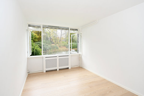 Fordelingsgangen er vinklet og har køkkenet og badeværelset til den ene side - ligefor er indgangen til det fyldige soveværelse - med fantastisk udsigt over den nærliggende sø med det rislende springvand.