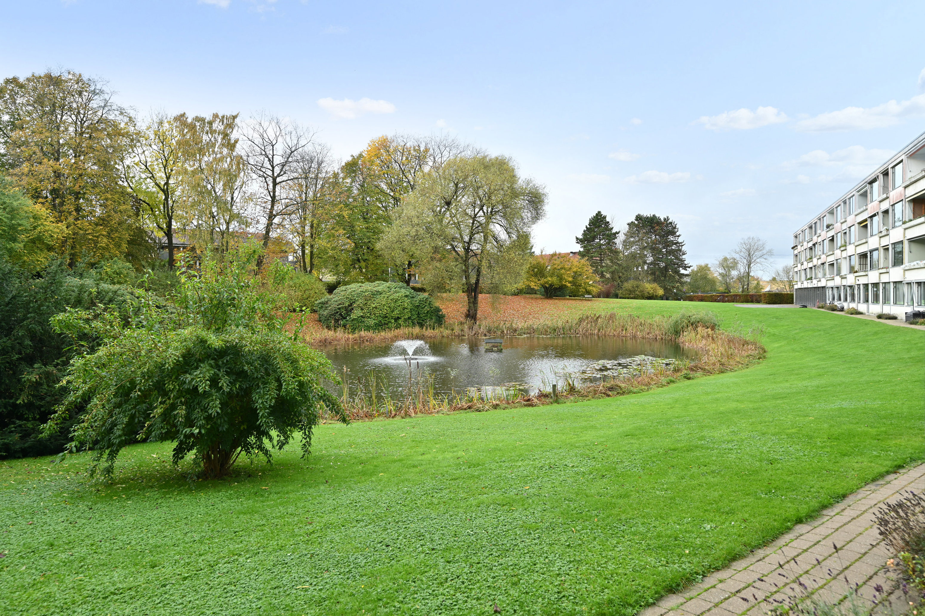 I den attraktive bebyggelse "Krogen" er parterre lejligheden i nummer 17 nu til salg - her får du en sublim beliggenhed med direkte udsigt til sø, springvand og parklignende have.