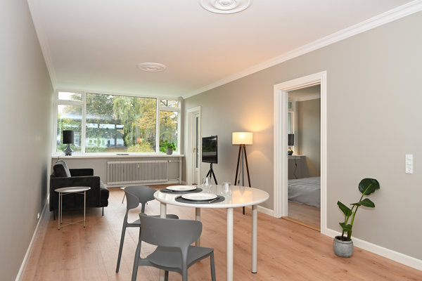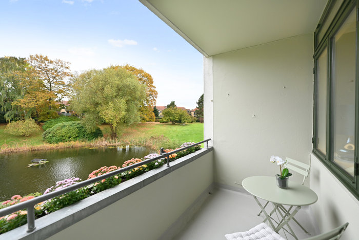 Stuen ligger i naturlig forlængelse af alrummet med store vinduespartier og direkte adgang til den solrige altan gennem en ny glasdør. Herfra er der et smukt kig over søen og det grønne parkområde uden at skulle anstrenge sig for at se vandet – perfekte rammer for afslapning og livsnydelse.