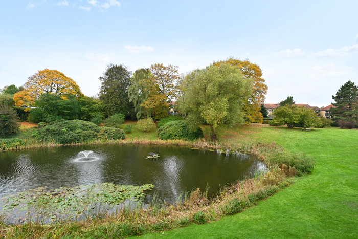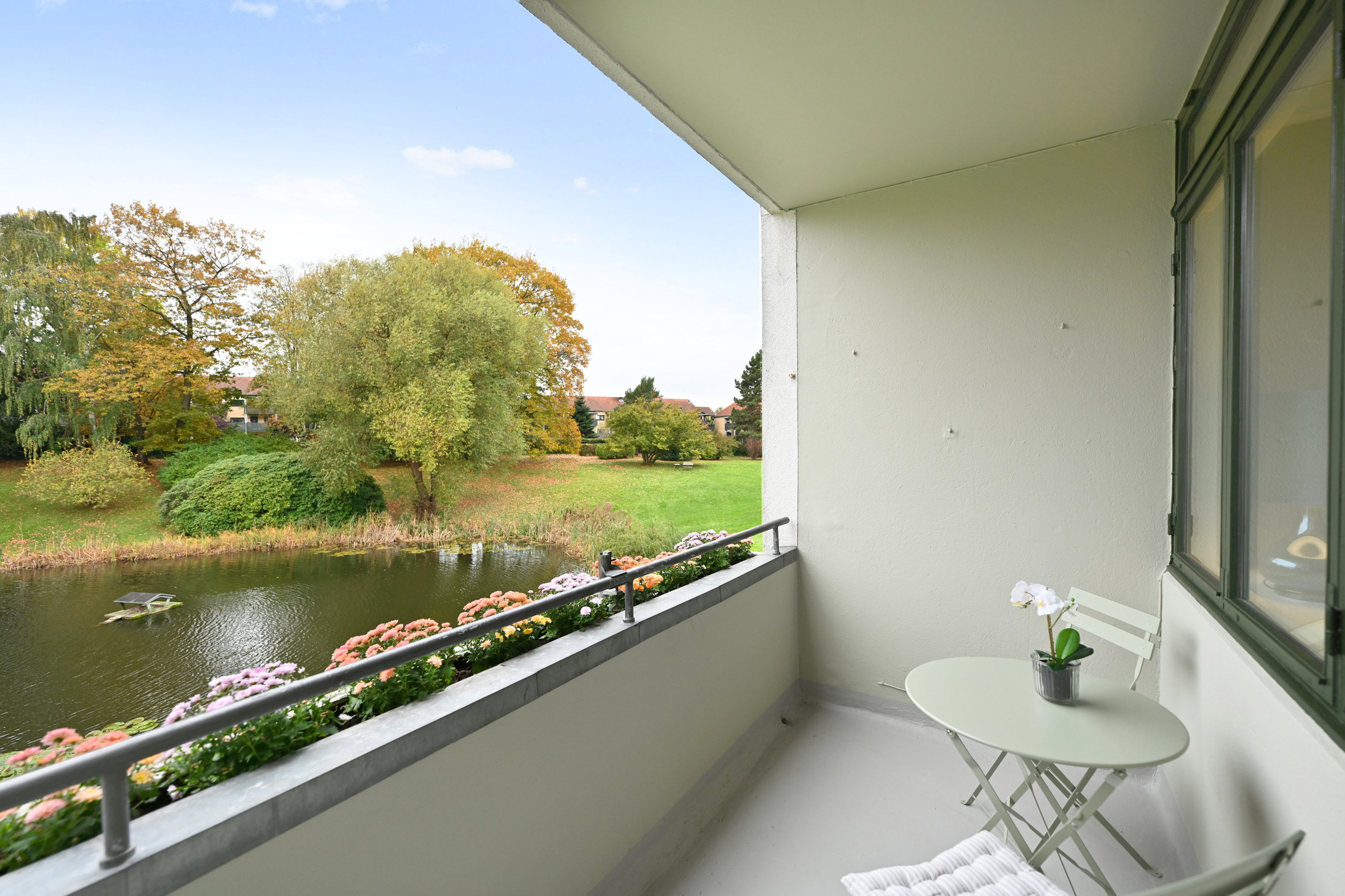Boligen rummer desuden en lang fordelingsgang med integreret skabsvæg til opbevaring af sko, overtøj og hverdagens fornødenheder – samt to gode værelser, hvoraf det ene har stor volumen og frit udsyn til sø med springvand.