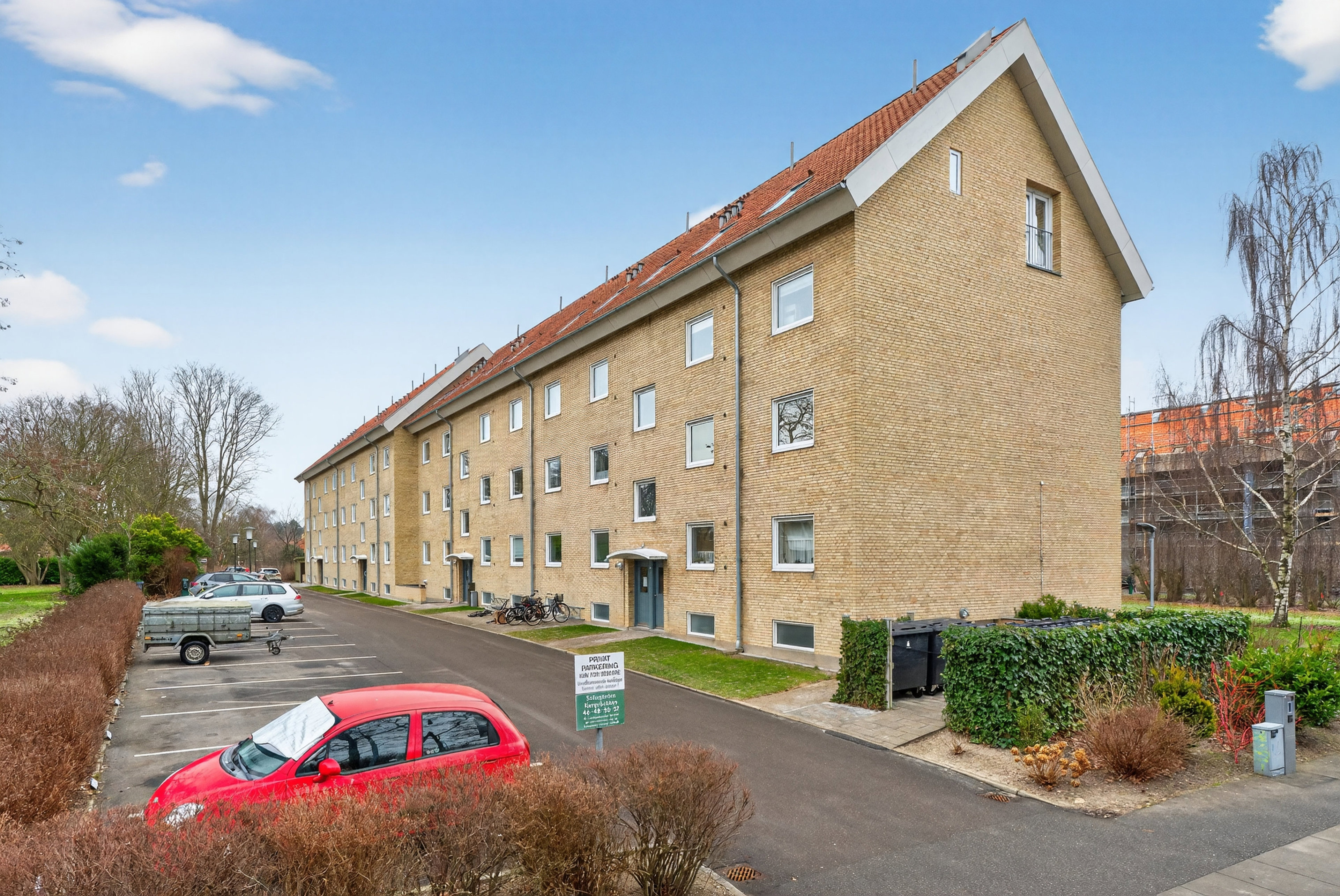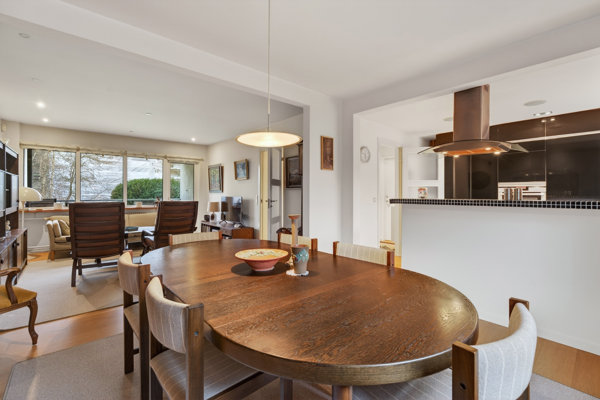 Med andre ord er det en bolig, der skiller sig ud. Forlægget er en pæn gulstensejendom fra 1960, der ligger som den bagerste bygning i bebyggelsen, og lejligheden har hjemme i et højt stueplan, som giver det bedste fra begge verdener. I har få trin op, og samtidig er der ikke indkig fra parkeringspladsen – eller fra naboejendommen, som er placeret på modsatte side af det store, brede fællesareal. I den forbindelse ligger Margretheparken som et grønt område mod syd, og til lejligheden hører også et praktisk kælderrum til opbevaring.