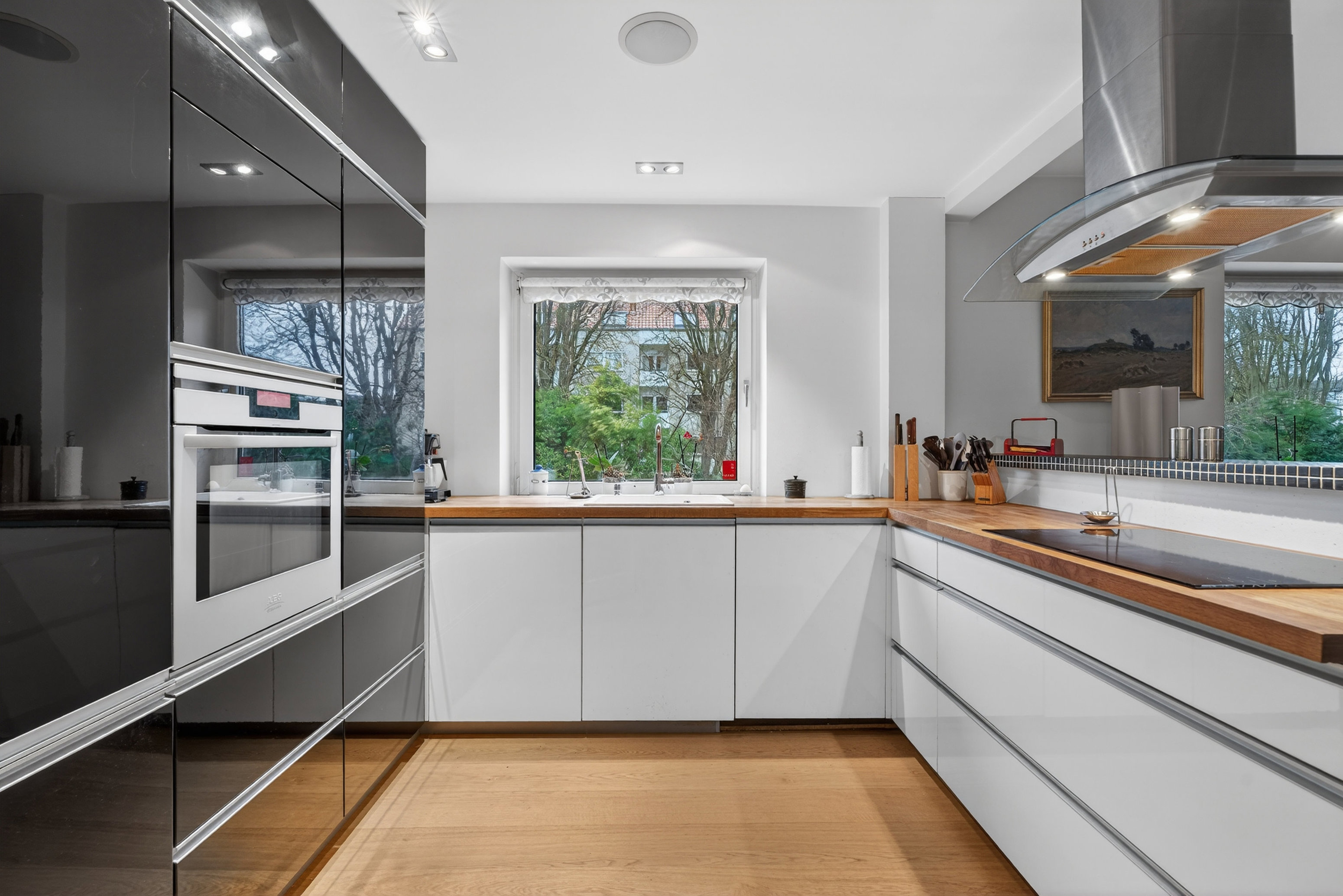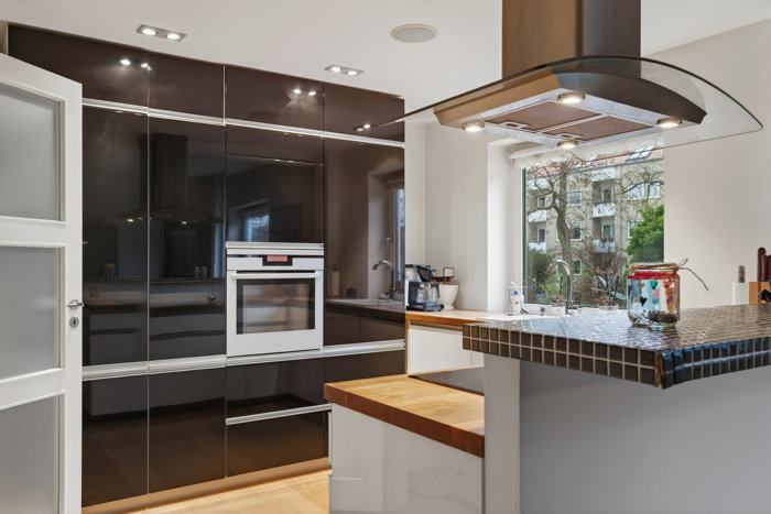 Af lejlighedens to primære værelser er det ene et gennemgangsværelse, der er velegnet til hjemmekontor, mens langt størstedelen af kvadratmeterne er tildelt det store opholdsområde, som hører til de absolutte sjældenheder for etageboliger. Her får I køkken-alrum og opholdsstue i åben forbindelse, så I kan dække op til hele familien. Endnu bedre bliver det, når I tager køkkenet i betragtning, for det er tidløst udført med mørke træbordplader og pæne elementer i sort og hvid højglans.