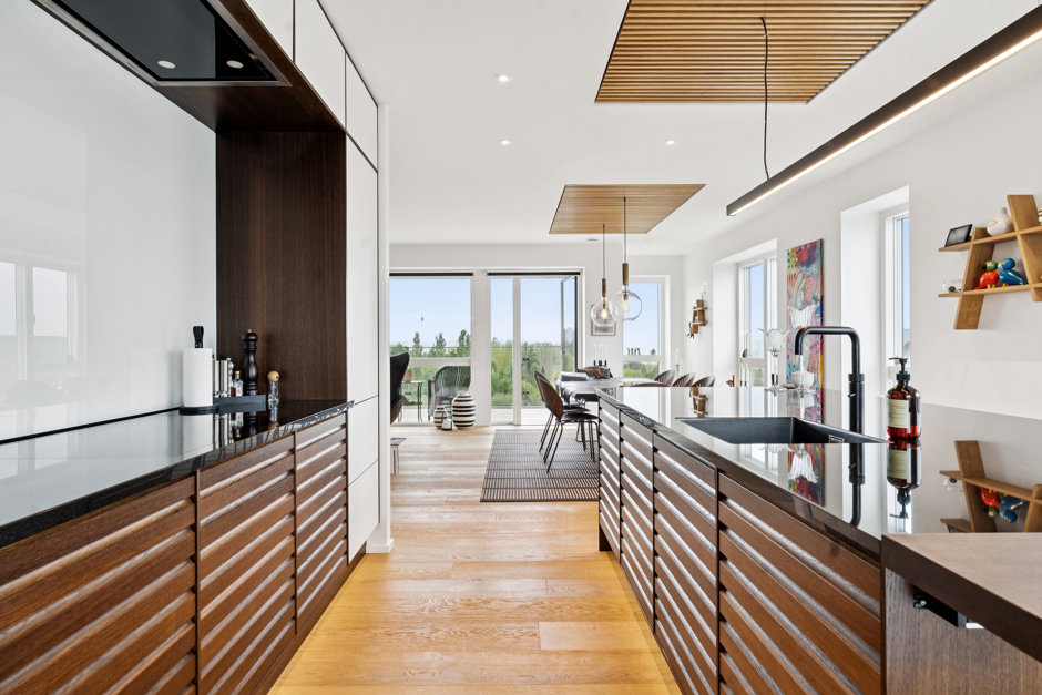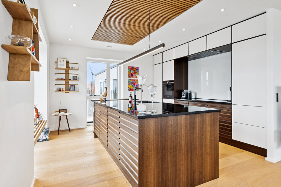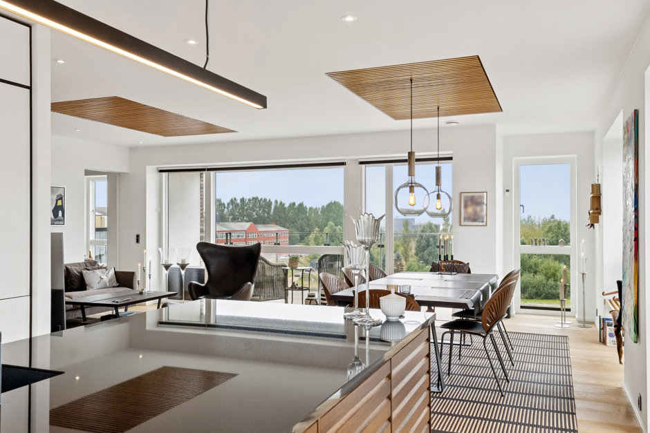 Lejligheden er indrettet med fokus på moderne komfort og gennemtænkte løsninger. Hjertet i boligen er det store køkken-alrum, hvor det stilrene køkken med kogeø indbyder til både madlavning og samvær. Her er der plads til at samle familie og venner omkring spisebordet, mens udsigten til vandet danner en naturlig baggrund. Stuen ligger i åben forbindelse hertil og byder på store vinduespartier, der giver et unikt lysindfald og en følelse af at bo midt i omgivelserne.