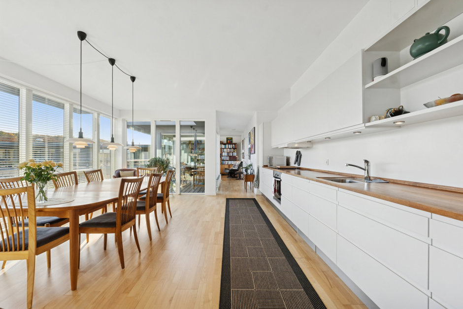 Lejligheden fremstår fuldstændig indflytningsklar, og det fornemmer I tydeligt i det store, lyse køkken-alrum, som er centrum i hjemmet. Køkkenet fremstår i et smukt design, og til hver sin side af køkken-alrummet har I to fantastiske stuer med masser af plads og et gavmildt dagslys.