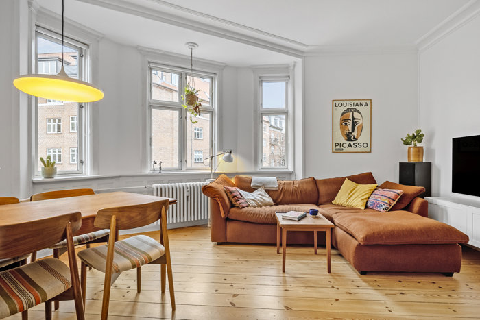 Stuen og spisestuen ligger samlet i et stort, lyst og åbent opholdsrum med flot lysindfald fra flere sider. Her er der rigelig plads til både sofaområde og spiseplads, hvilket gør rummet ideelt til både hverdagsliv og gæstebesøg.