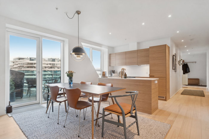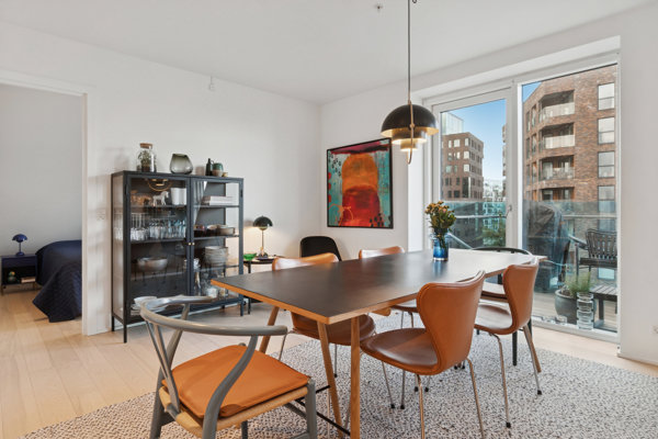 Lejligheden byder på en gennemtænkt planløsning med et åbent køkken-alrum, der naturligt samler boligen og skaber ideelle rammer for både hverdagsliv og gæstebesøg. Køkkenet er nyere, udført i høj kvalitet og med varme elementer. Køkkenet er i smukke egetræs materialer samt en keramisk bordplade, derudover en massiv messingvask. De store vinduespartier sikrer et fantastisk lysindfald og understreger boligens lyse og luftige udtryk.
