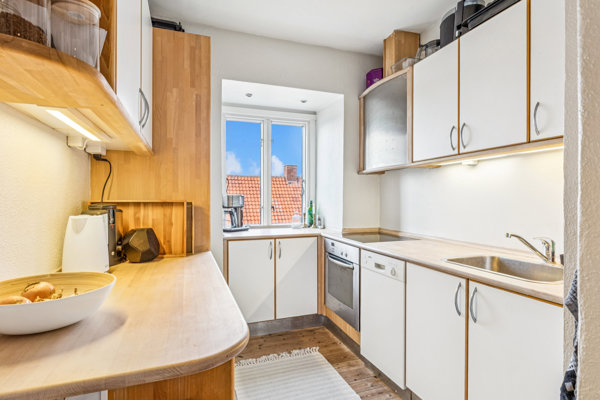 Det er fortsat beliggenhedens gode stemning, der præger på adressen, for du får hjemme på 2. sal i en fin rødstensejendom, hvorfra du rigtigt kan nyde udsigten til vejens smukke villaer og grønne forhaver. Endnu mere forstadsidyl venter forneden, hvor bede pryder langs husmuren, mens fortovet løber side om side med et grønt bælte. Her pakkes borde-bænke-sæt og solrige stunder på græsset ind i velvoksne træer og høje buske.