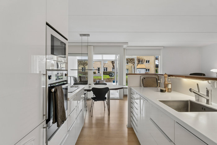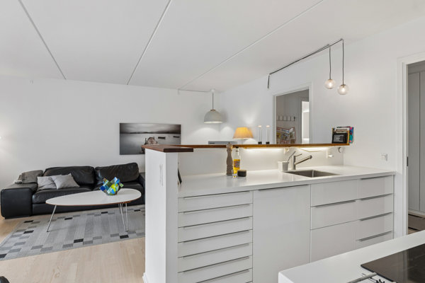 Hjemmet centrerer sig omkring det lyse opholdsrum og køkken-alrum, hvor der er god plads til både hverdag og gæster. Herfra er der direkte adgang til den skønne udestue, som fungerer som et ekstra opholdsrum og skaber en glidende overgang mellem inde- og udeliv. De udvendige fuger i udestuen bliver løbende vedligeholdt og opfrisket af ejerforeningen, hvilket bidrager til et velholdt helhedsindtryk.