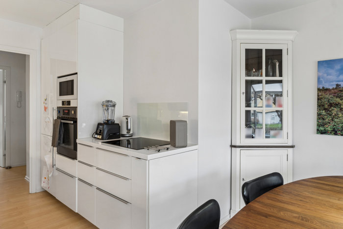 Boligen på 79 kvm fremstår moderne og funktionelt indrettet med en åben og indbydende planløsning. I forbindelse med udskiftning af gulve har sælger valgt at fjerne dørtrin samt dørene mellem entré, stue og køkken, hvilket skaber en ekstra rummelig og sammenhængende boligoplevelse. Ønsker man en mere klassisk opdeling, er de oprindelige døre bevaret og opmagasineret i det opvarmede kælderrum, klar til genmontering.