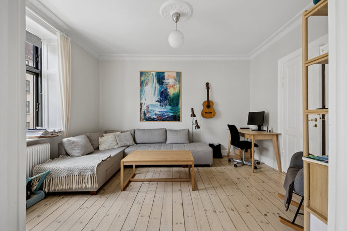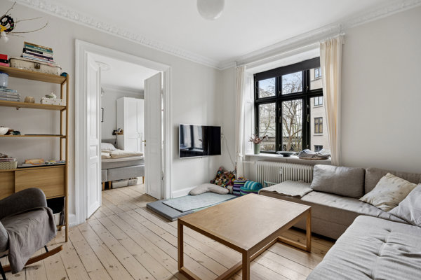 Vi skal til anden etage i en markant Frederiksberg-ejendom, hvis klassicistiske ydre med facadedetaljer og store dannebrogsvinduer har prydet gaden siden 1913. Indenfor er det en lejlighed med et lignende udtryk – elegant med smuk stukkatur, plankegulve, fyldningsdøre og de tilsvarende store dannebrogsvinduer – der møder dig.