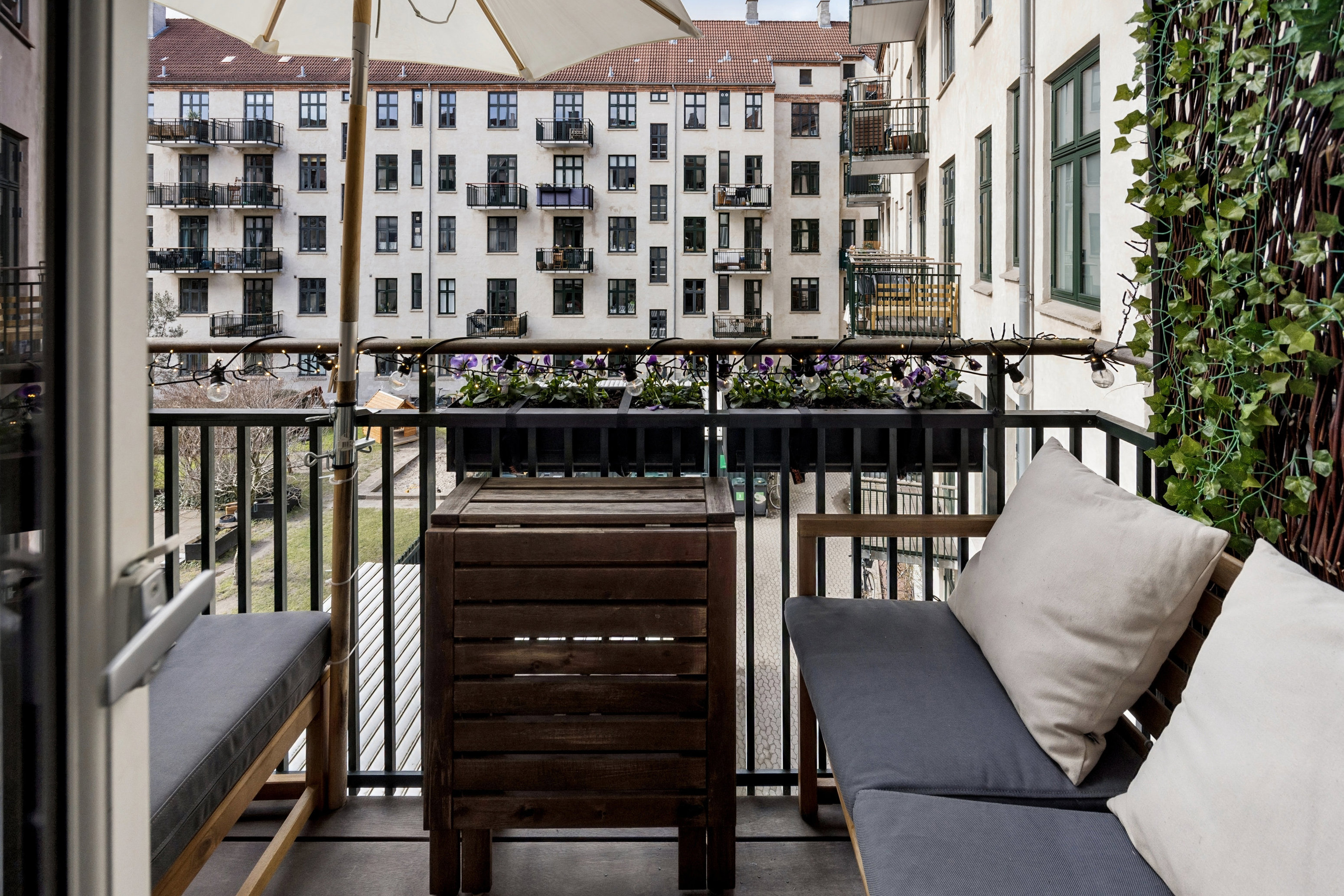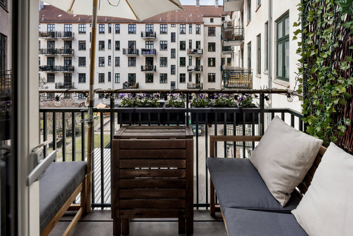 Fra det ene værelse åbner et vestvendt uderum sig i form af en god og møblerbar altan, som særligt i eftermiddags- og aftentimerne bliver et favoritspot. Altanen peger ned mod en særdeles hyggelig fællesgård, hvis grønne rammer og gode sidde- og legeområder gør den til en indbydende have for alle ejendommens beboere.