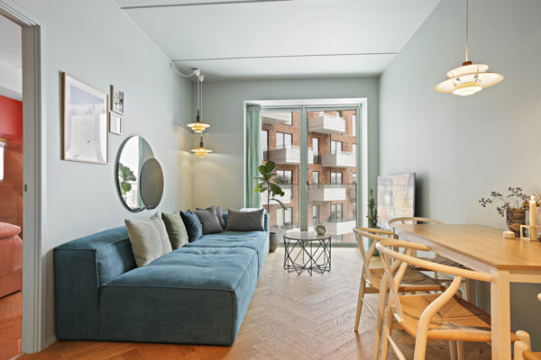 Lejligheden byder på et lyst og indbydende køkken/alrum i åben forbindelse med stuen, hvor store vinduespartier og fransk altan sikrer et smukt lysindfald og en flot udsigt over området. Boligen fremstår gennemført med brede sildebensgulve, gulvvarme i alle rum og eksklusive tilvalg. Det elegante Uno form-køkken er udført med stilrene fronter og kvalitets-hårde hvidevarer fra Miele, og indretningen giver god plads til både spiseafdeling og opholdsmiljø.