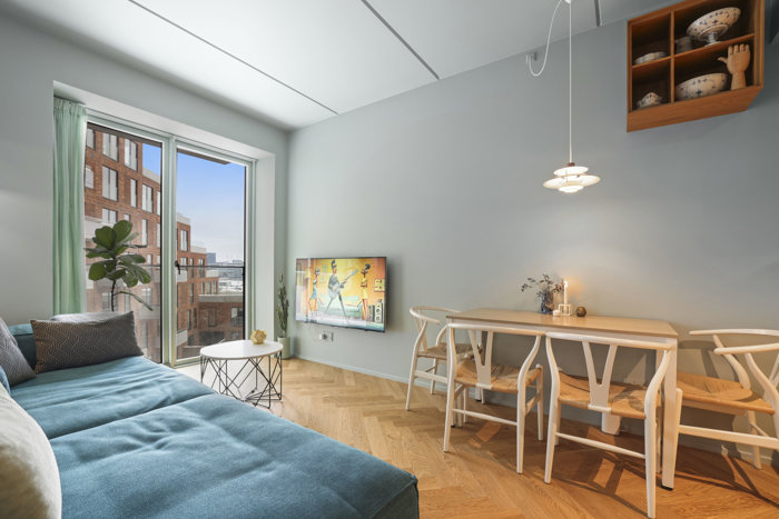 Soveværelset er regulært og indretningsvenligt med indbygget skab og direkte udgang til den private altan, hvor du bor i læ og med behagelig afstand til genboer. Her kan solen nydes det meste af dagen, og altanen fungerer som et naturligt ekstra opholdsrum i sommerhalvåret.