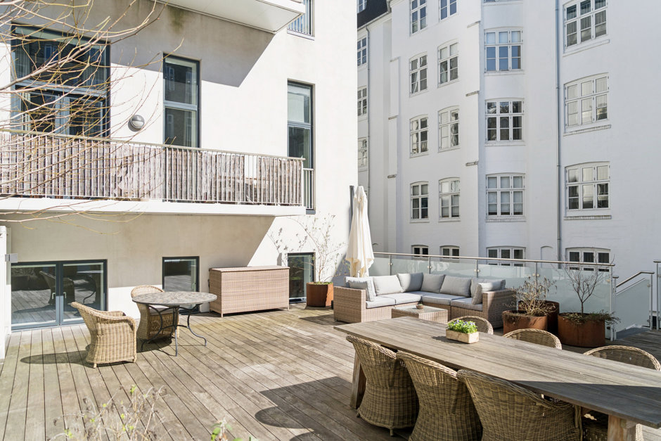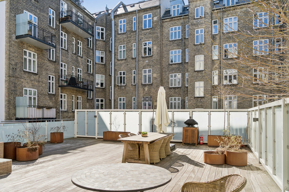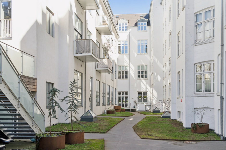 Lejligheden er beliggende i et smukt, totalrenoveret baghus, hvor roen sænker sig i det øjeblik, du træder ind gennem porten. Her bor du fuldstændig ugeneret – som i din egen lille oase midt i byen – og med elevator direkte op til boligen. Samtidig får du adgang til en stor, indbydende fælles tagterrasse, hvor solen, udsigten og de rolige omgivelser kan nydes i fulde drag.