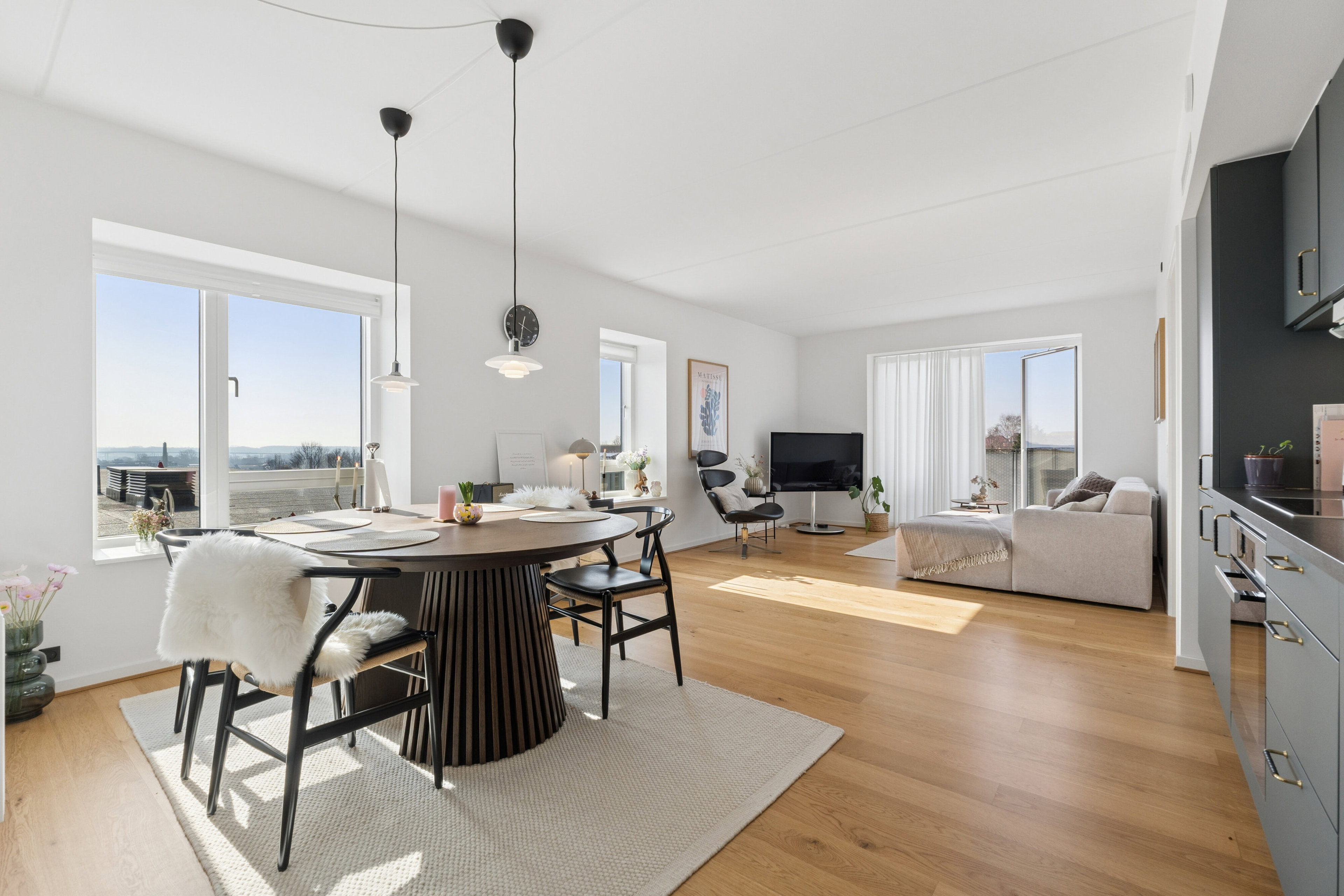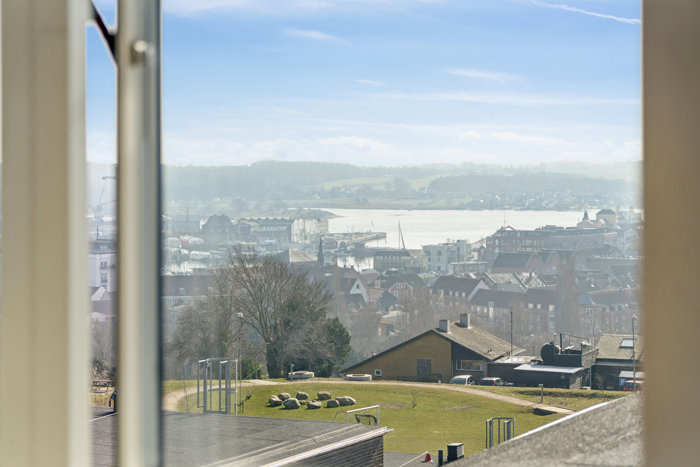 Denne attraktive ejerlejlighed er beliggende hvor den tidligere Nordre Skole lå, som i 2021 blev ombygget til moderne og indbydende ejerlejligheder. Lejligheden ligger på 4. sal og yderst i bygningen, hvilket giver en helt særlig ro samt en imponerende udsigt over byen. Fra lejligheden kan man nyde udsigten over hustagene – og man kan endda se helt til Vindeby.